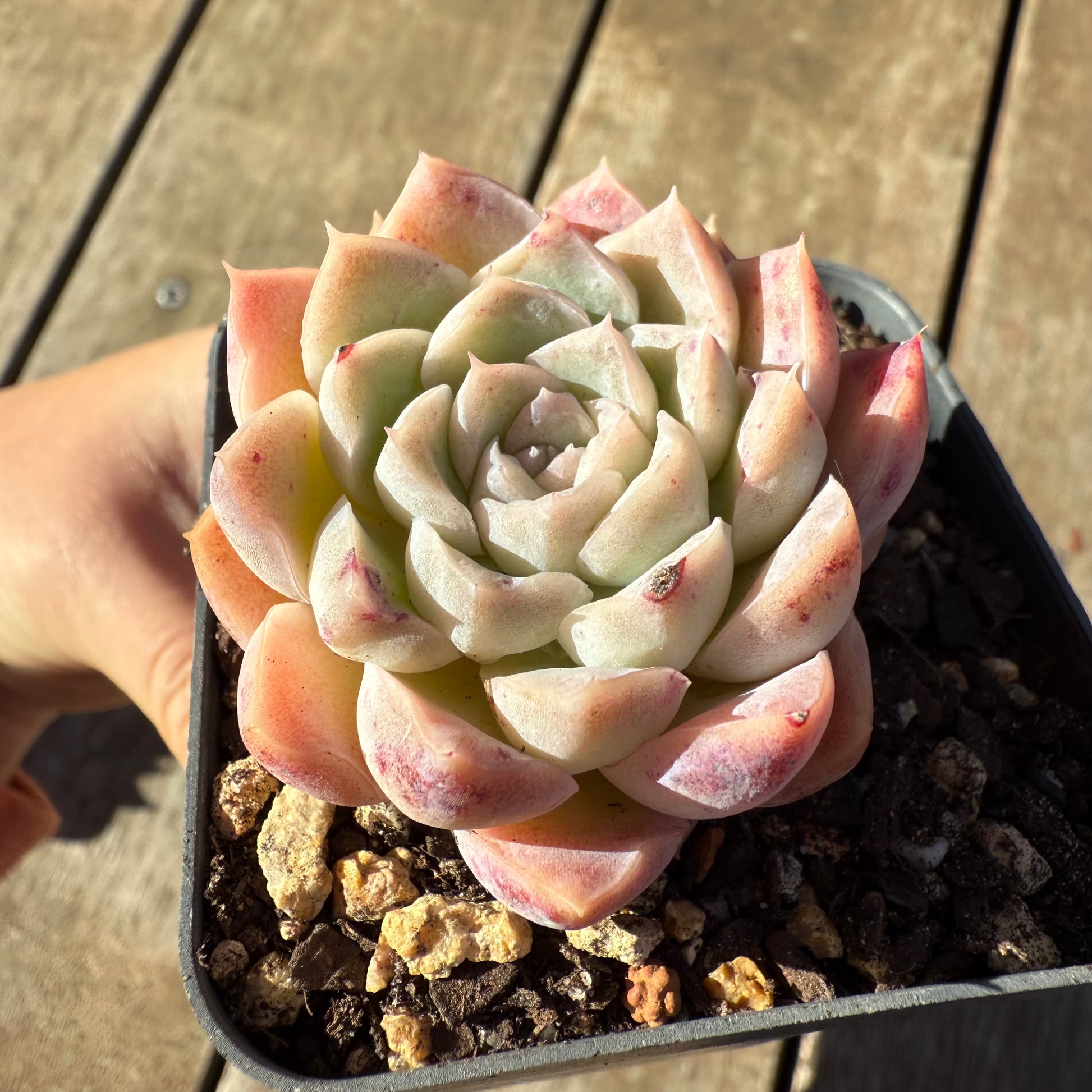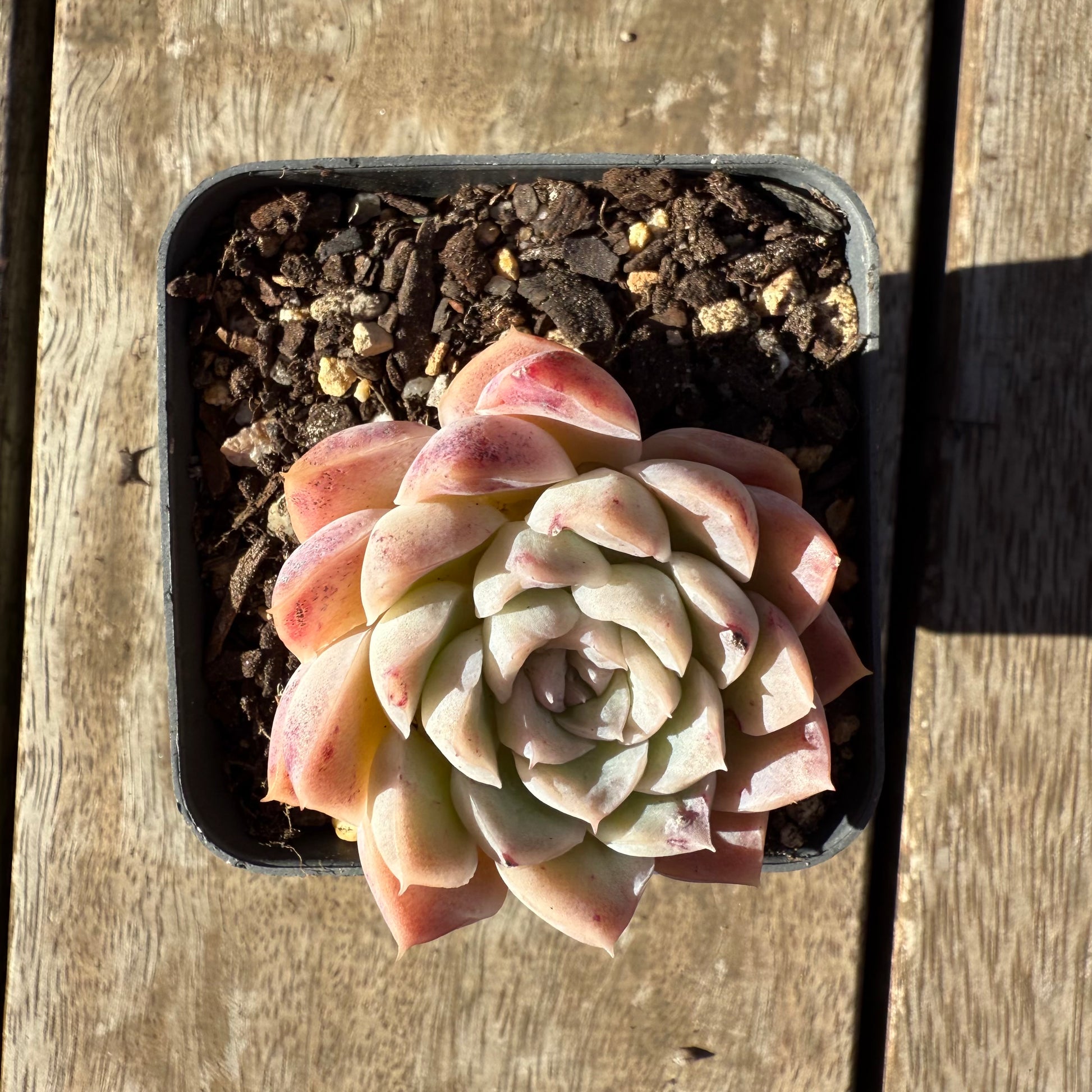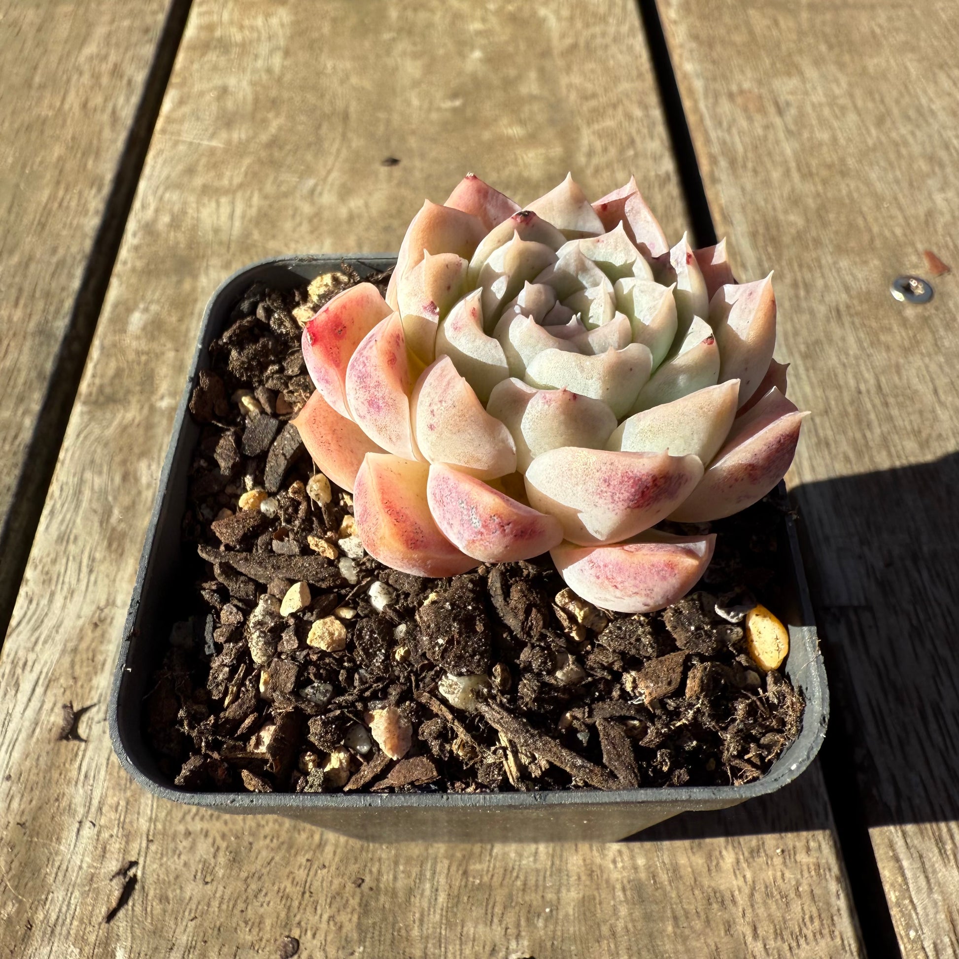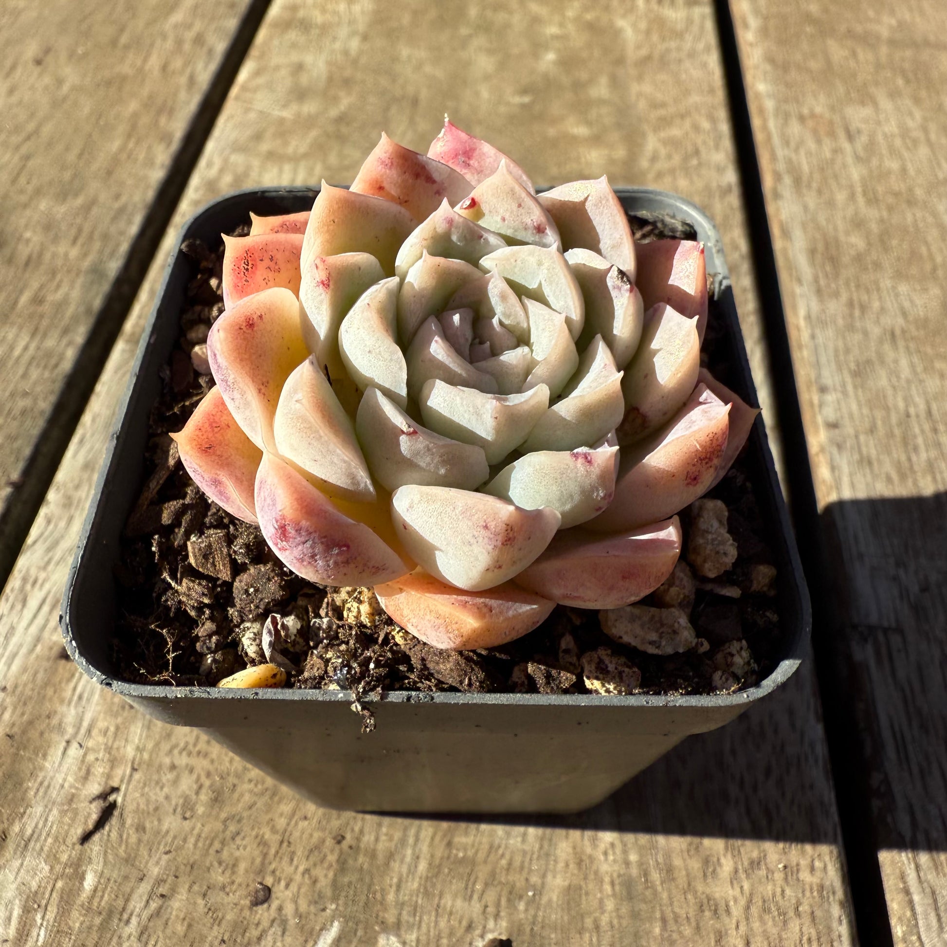 A hybrid variety. Forms blood speckles on outer leaves when stressed. Prefers full sun.