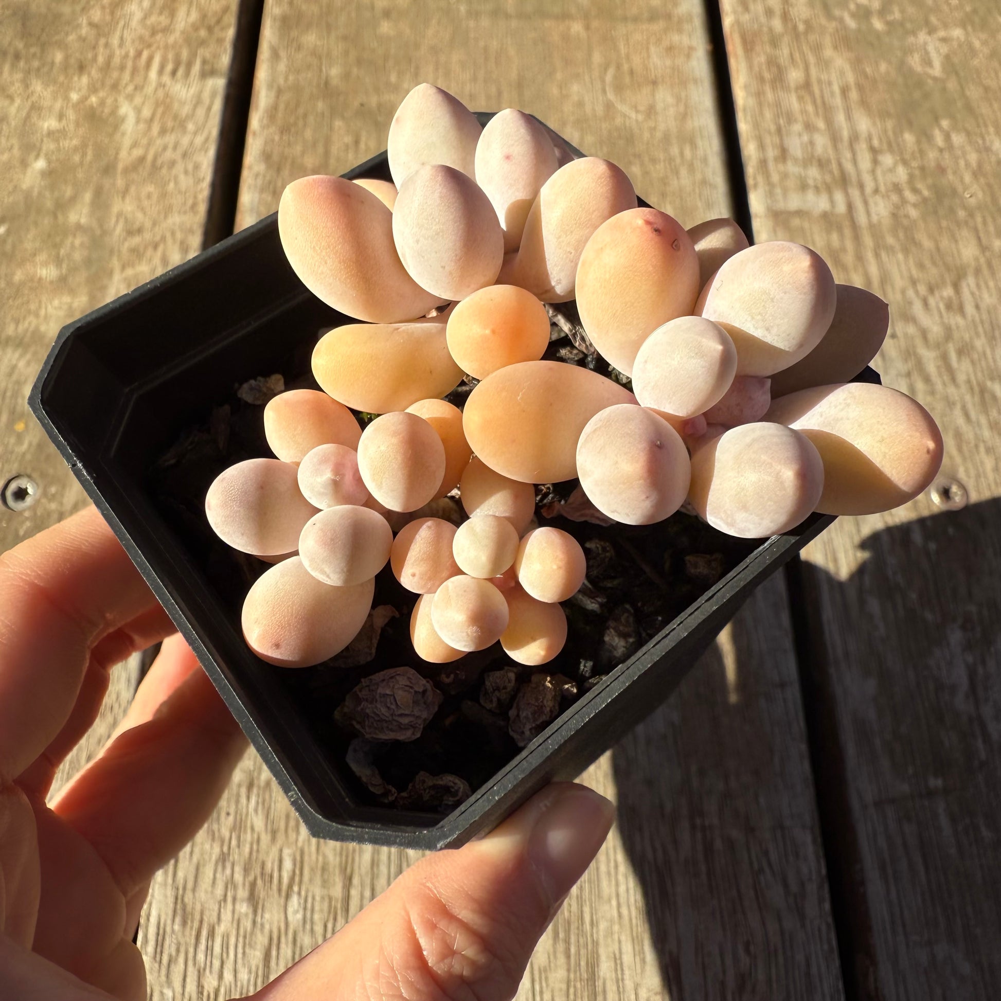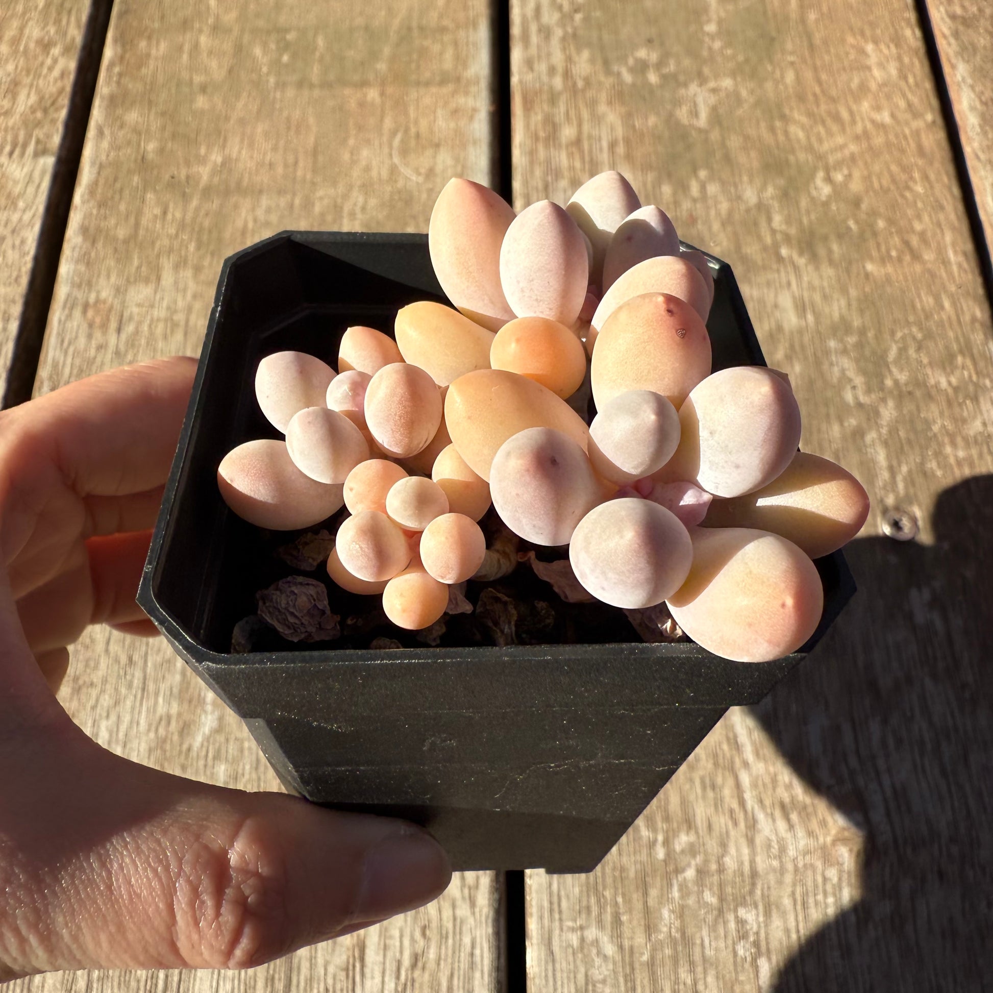 This is possibly the hybrid of Pachyphytum Oviferum x Pachyphytum Baby Finger. It shares a similar look with baby finger but appears to be in a more yellow tone rather than blue. When stressed it can become orange/pink/yellow. Prefers full sun.