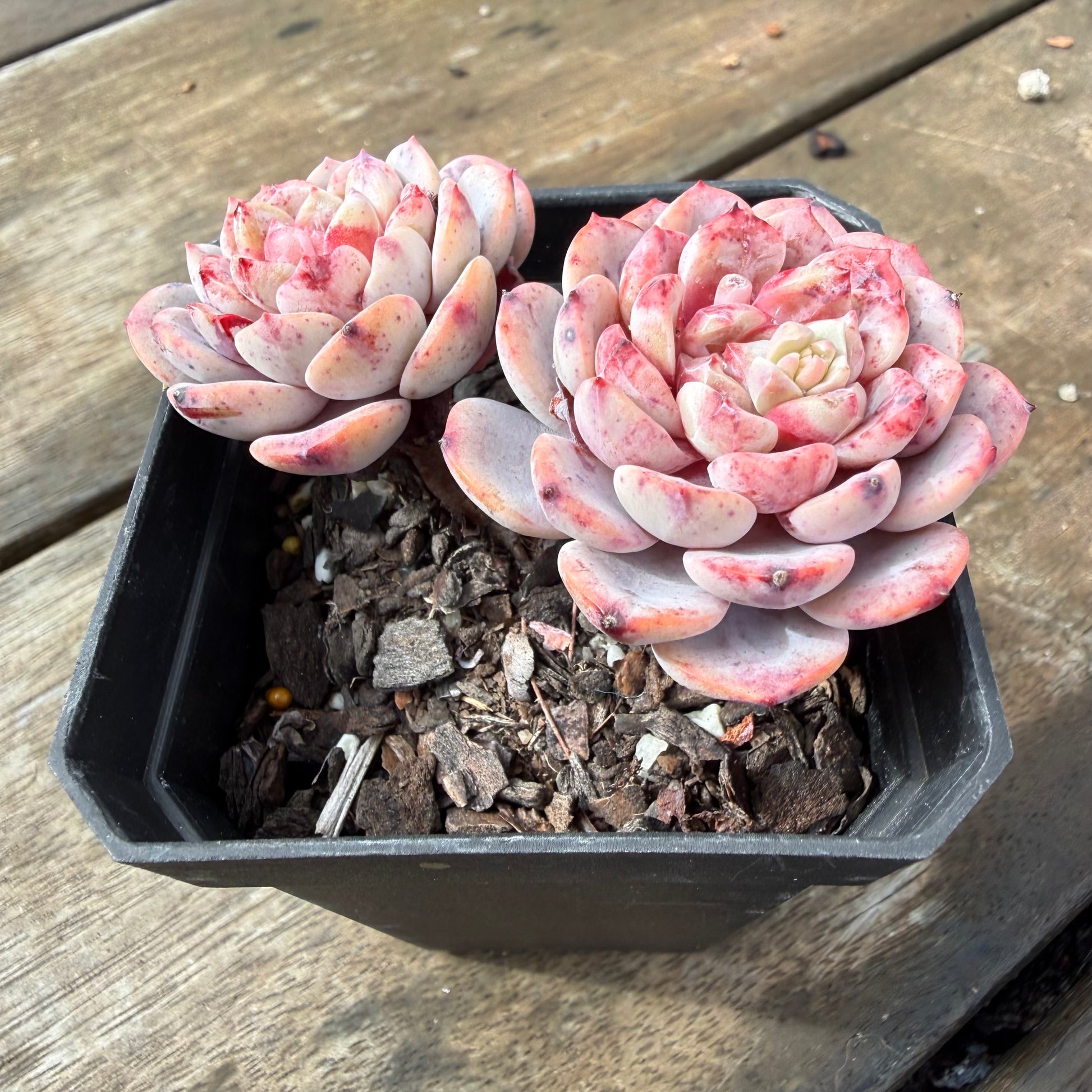 A Korean hybrid. It has powdery pink leaves that will stress to pink/purple when grown hard. Prefers full sun.