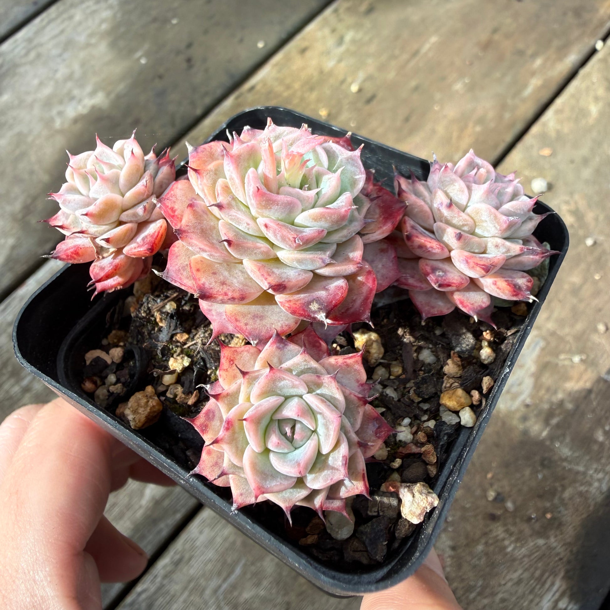 Echeveria Fiona's Choice is a hybrid of E.halbingeri. Forms a nice pink rosette when stressed and pups around itself. Easy to care. Prefers full sun.