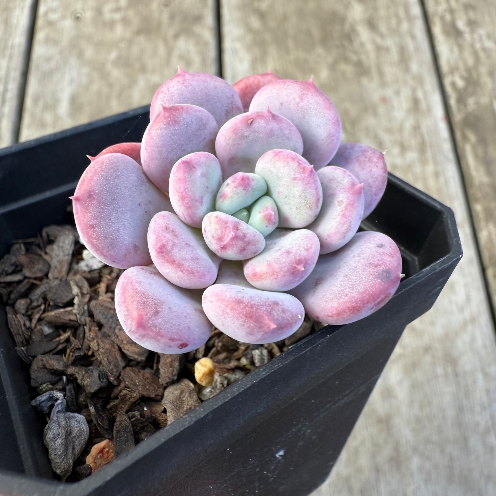 Echeveria 'Mulan' has dark purple leaves that curves inwards. It will stress to pinkish purple. Prefers full sun.