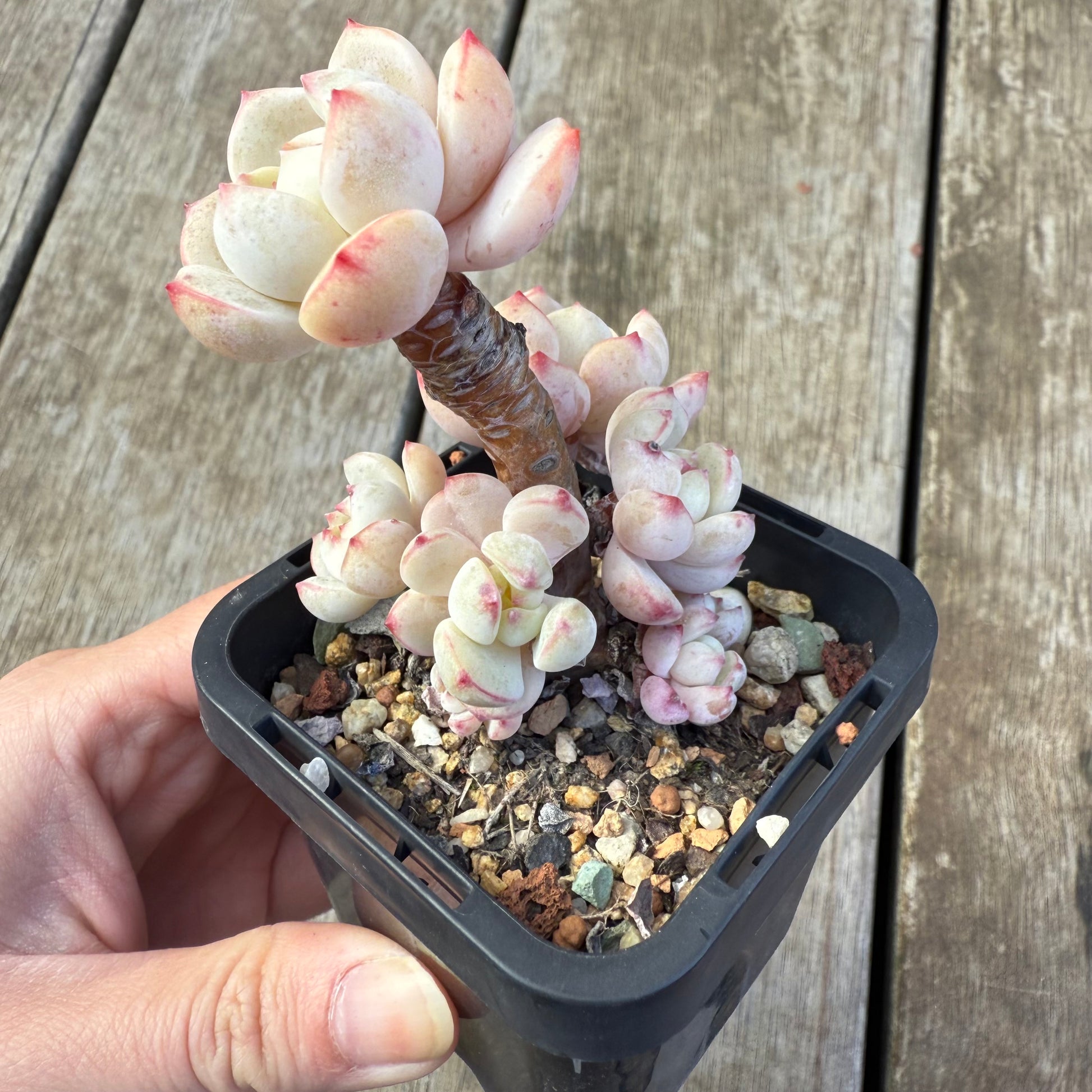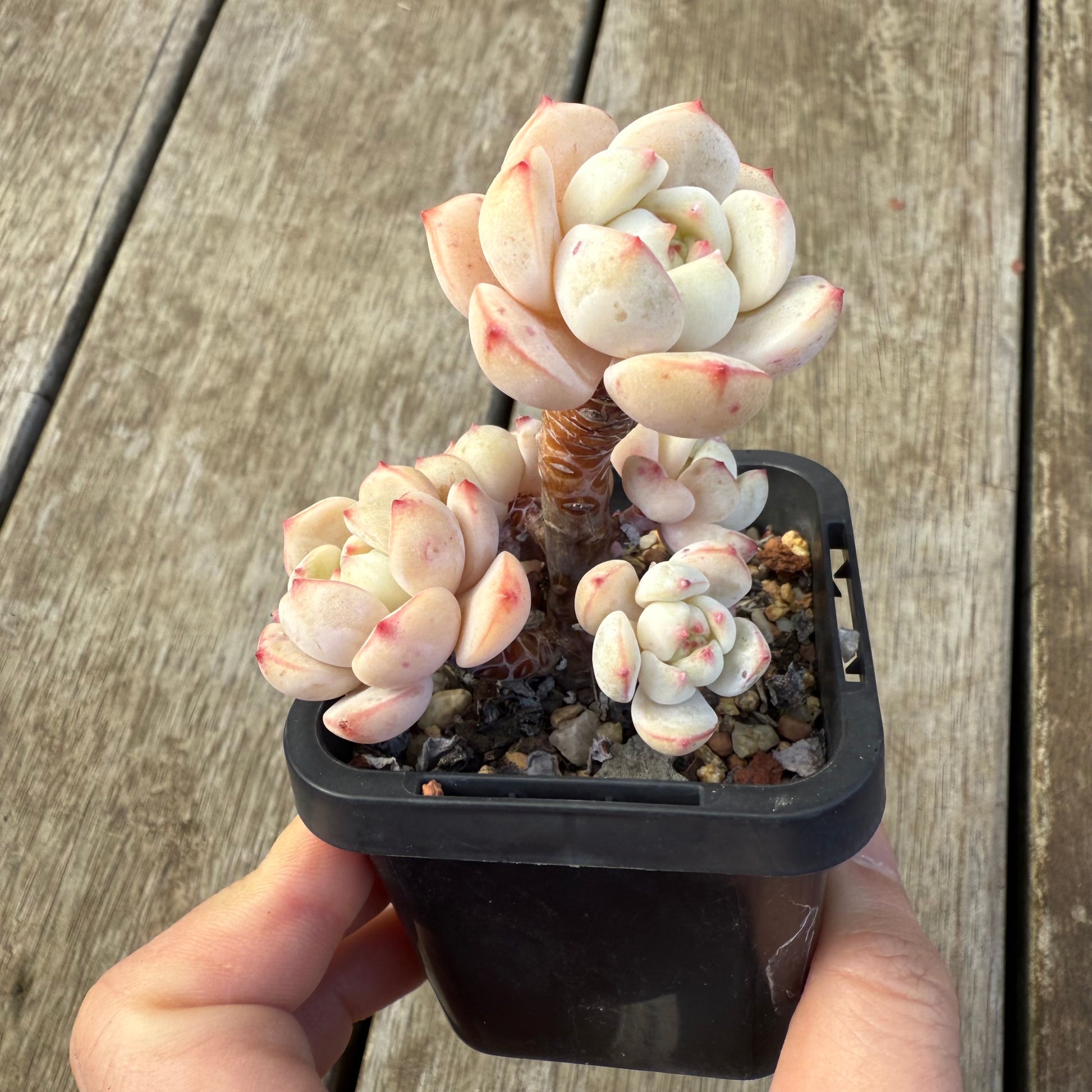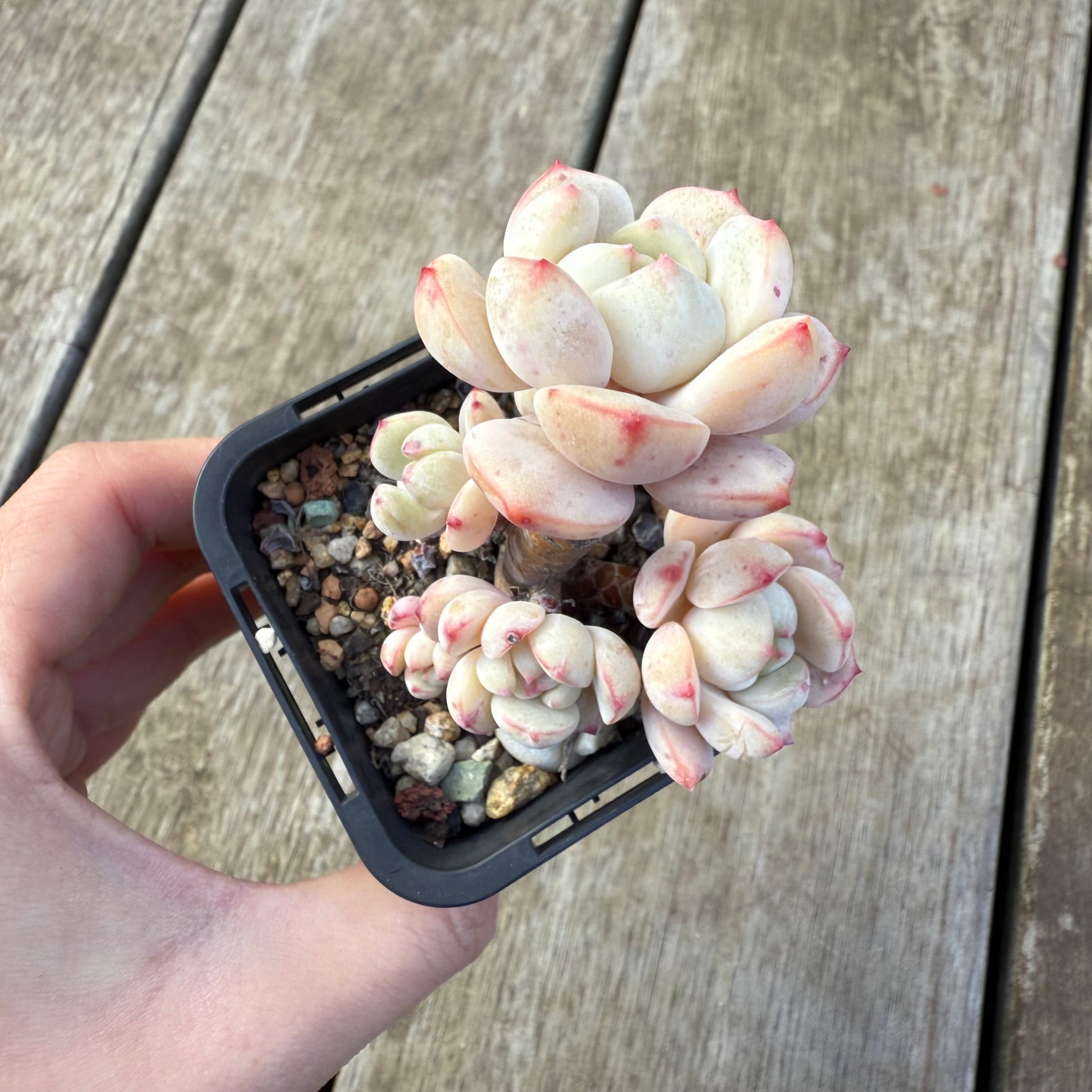 Hybrid of Echeveria derenbergi and Sedum clavatum. When grown well, it will form a compact rosette with red edge. Prefers full sun.