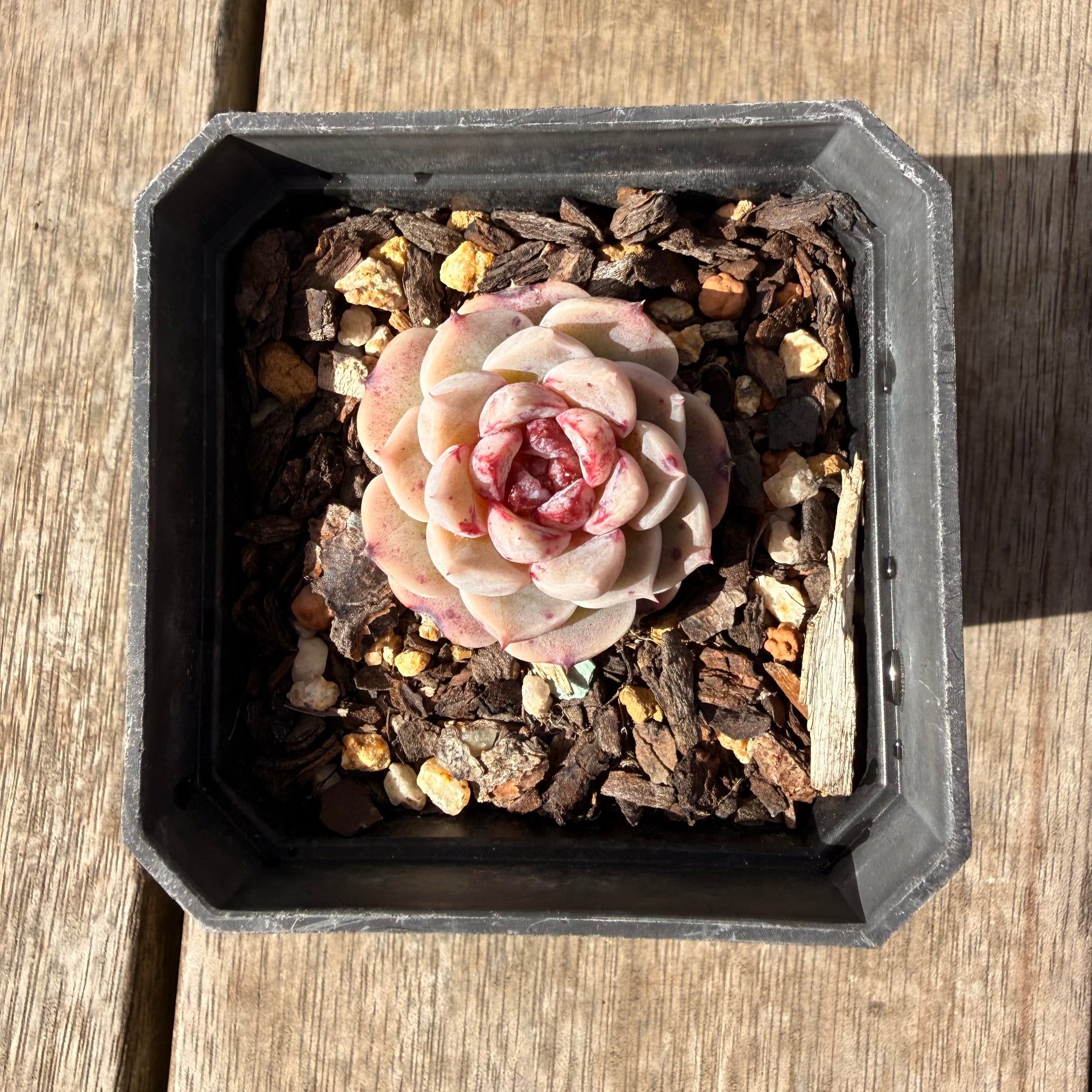 Echeveria Red Velvet is a stunning hybrid of E.Hyalina. It has very compact rosette that will stress to pink/purple when grown hard. Prefers full sun.