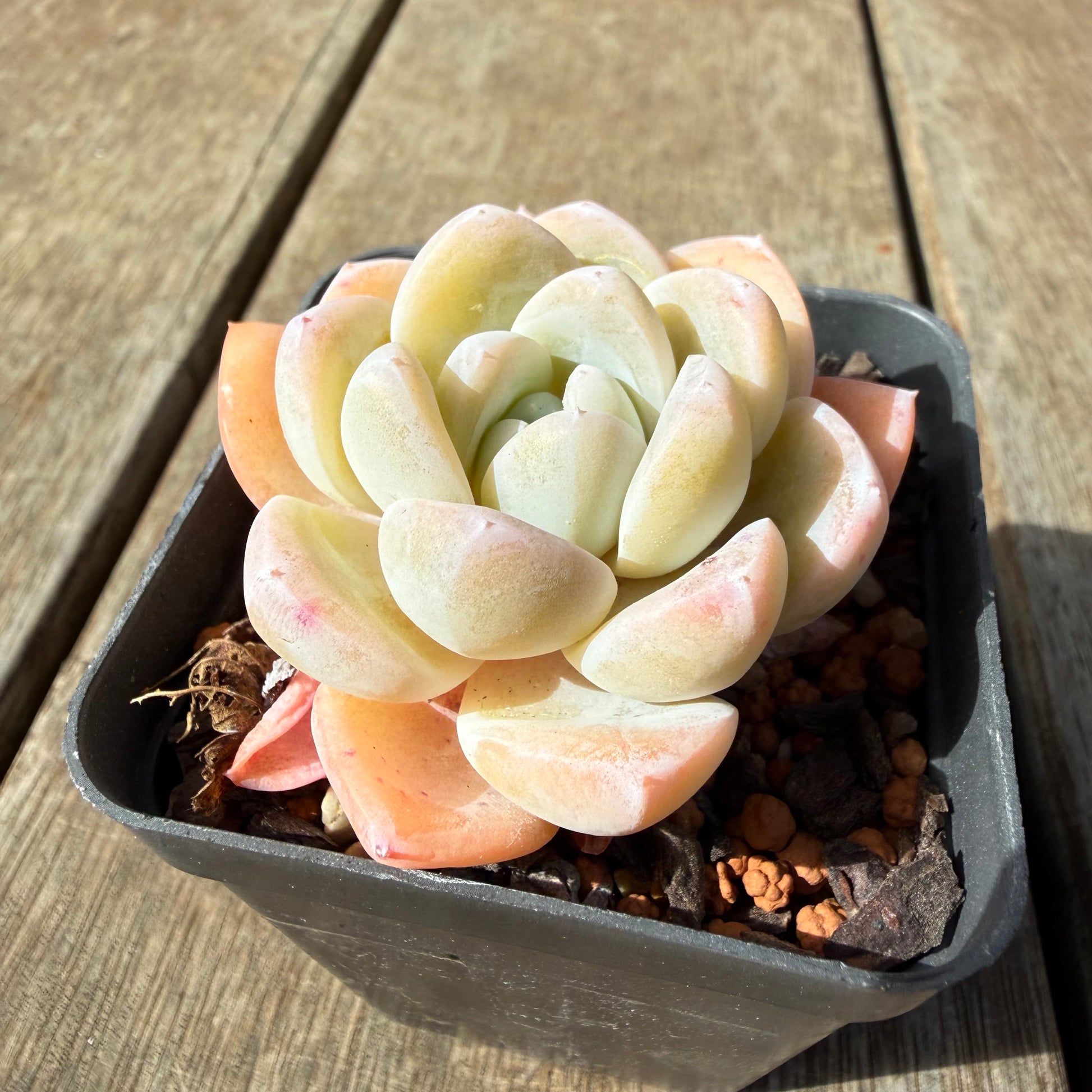 Echeveria 'White Shell' has triangular leaves with thick white powder. The back of leaves blush pink/orange when stressed. Prefers full sun.