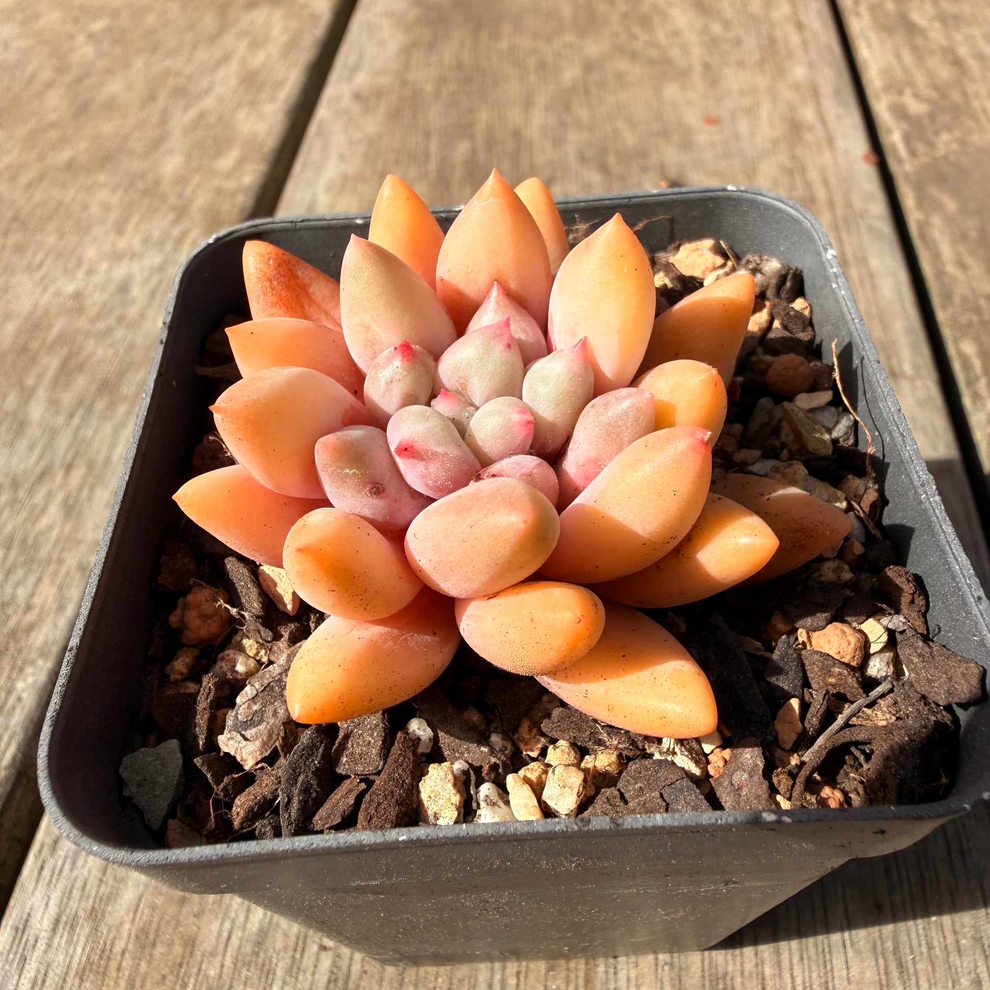 This is a classic variety with pointed grey-pink leaves that tips stress to bright pink when stressed. Prefers full sun.