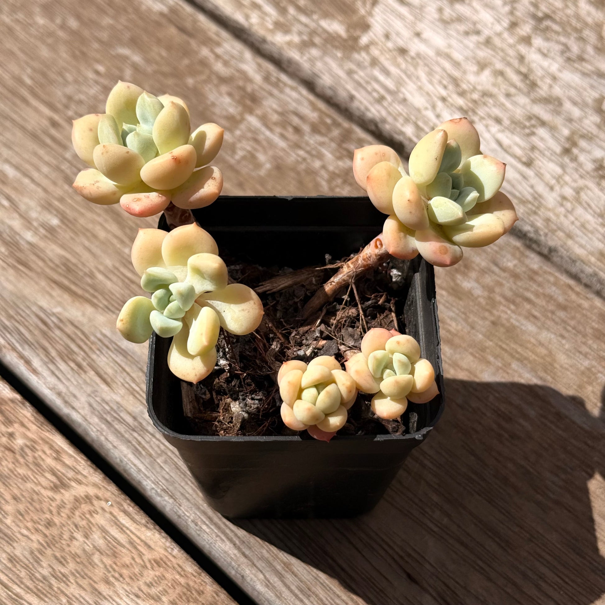 Sedeveria Pudgy is a classic round and chubby hybrid between sedum and echeveria. It offsets easily. Prefers full/partial sun.