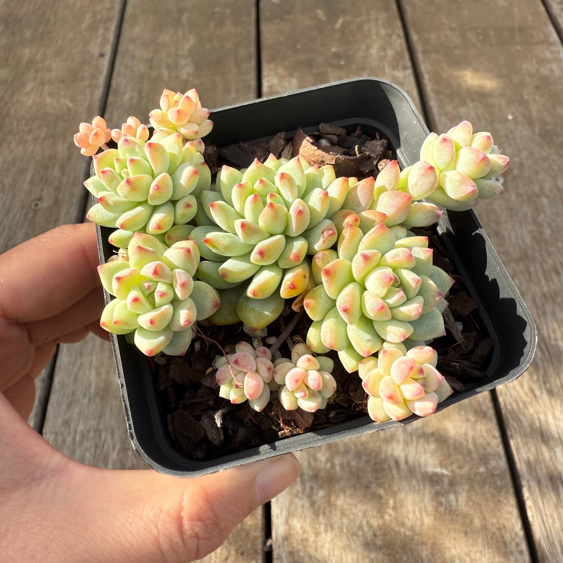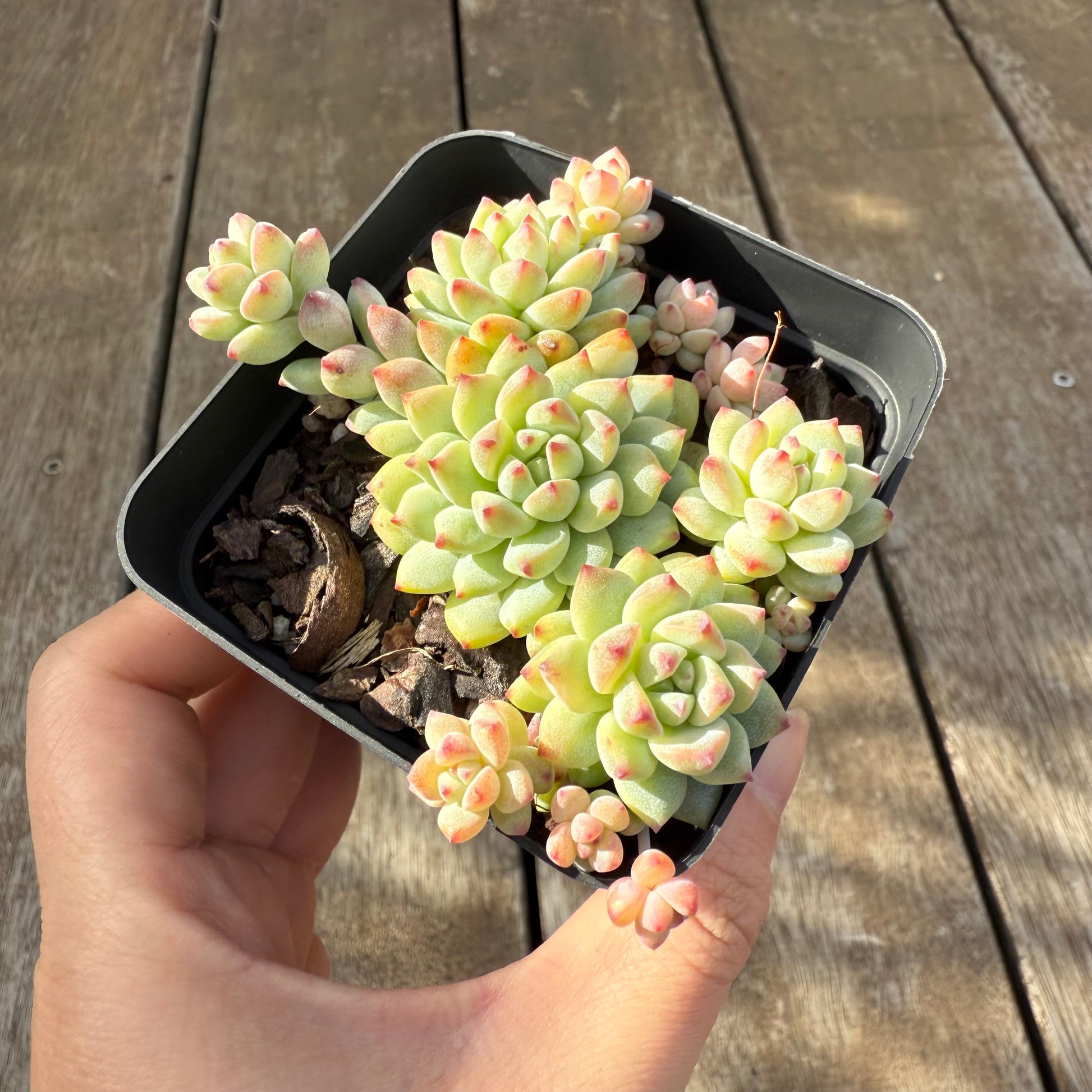 Also known as 'Caramel Elf'. Dainty rosettes that stress to dark orange/caramel colour. It pups and forms a clump easily. Prefers full sun.