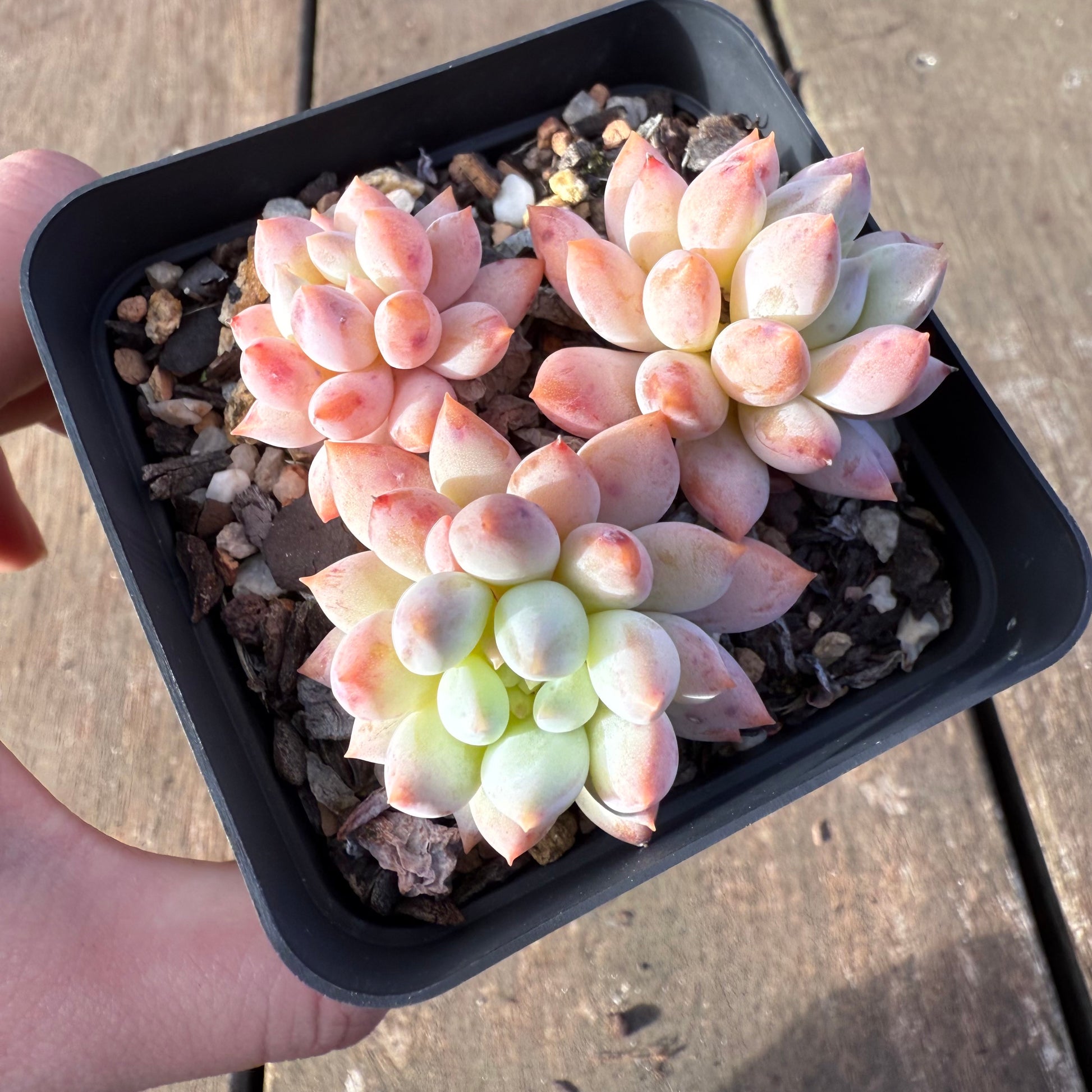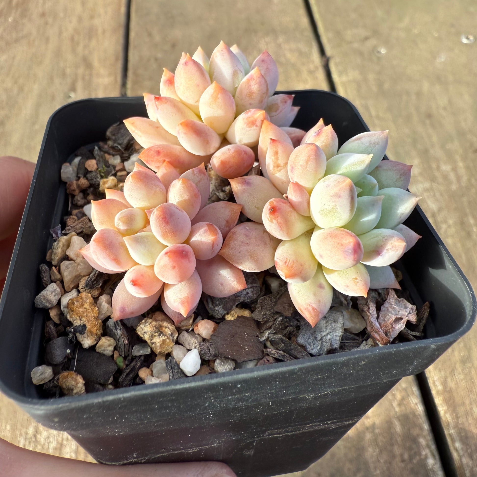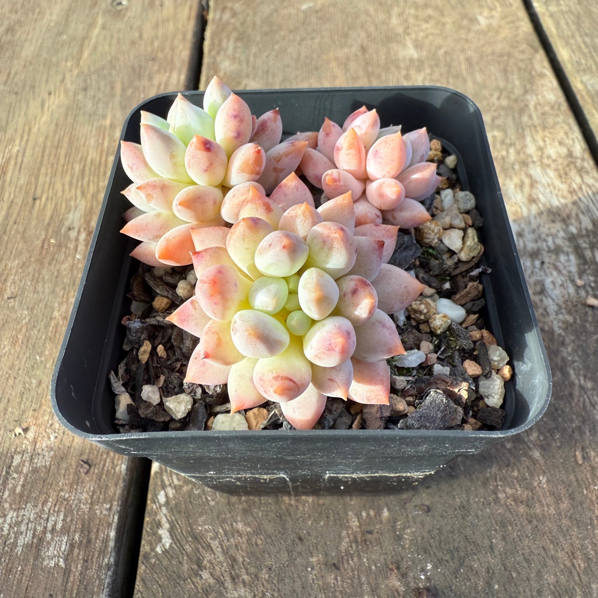 Echeveria 'Icecream' has pointy leaves that will stress to soft pink. Prefers full sun.