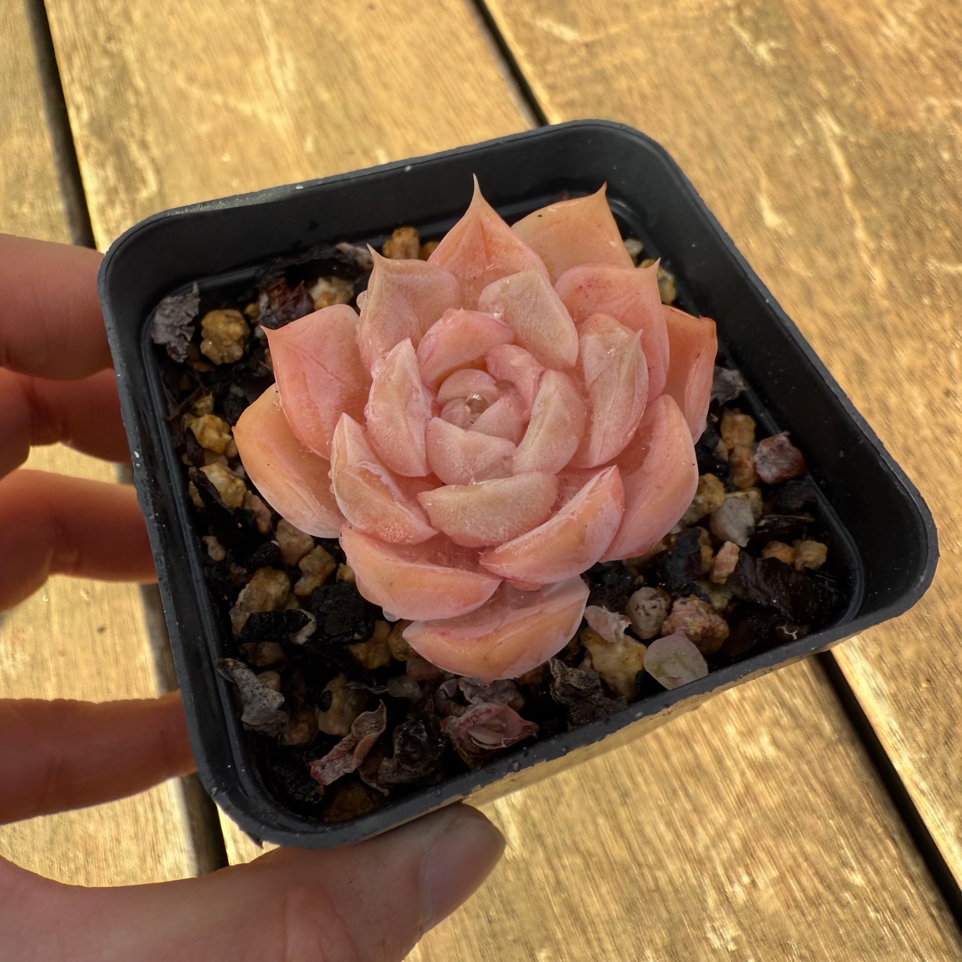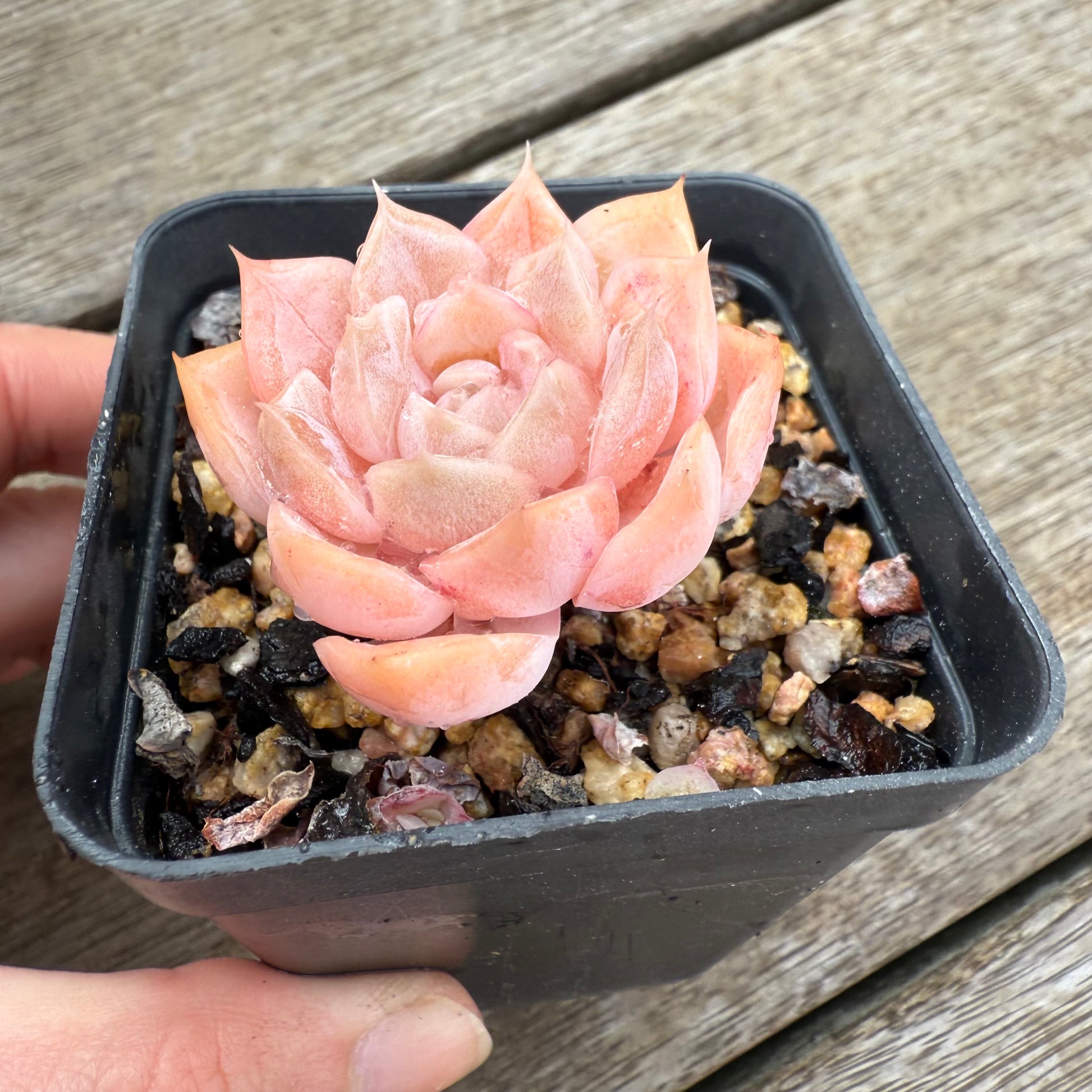 Echeveria 'Star Dew' is a stunning korean hybrid. It has pink leaves and forms white markings on leaves. Prefers full sun.