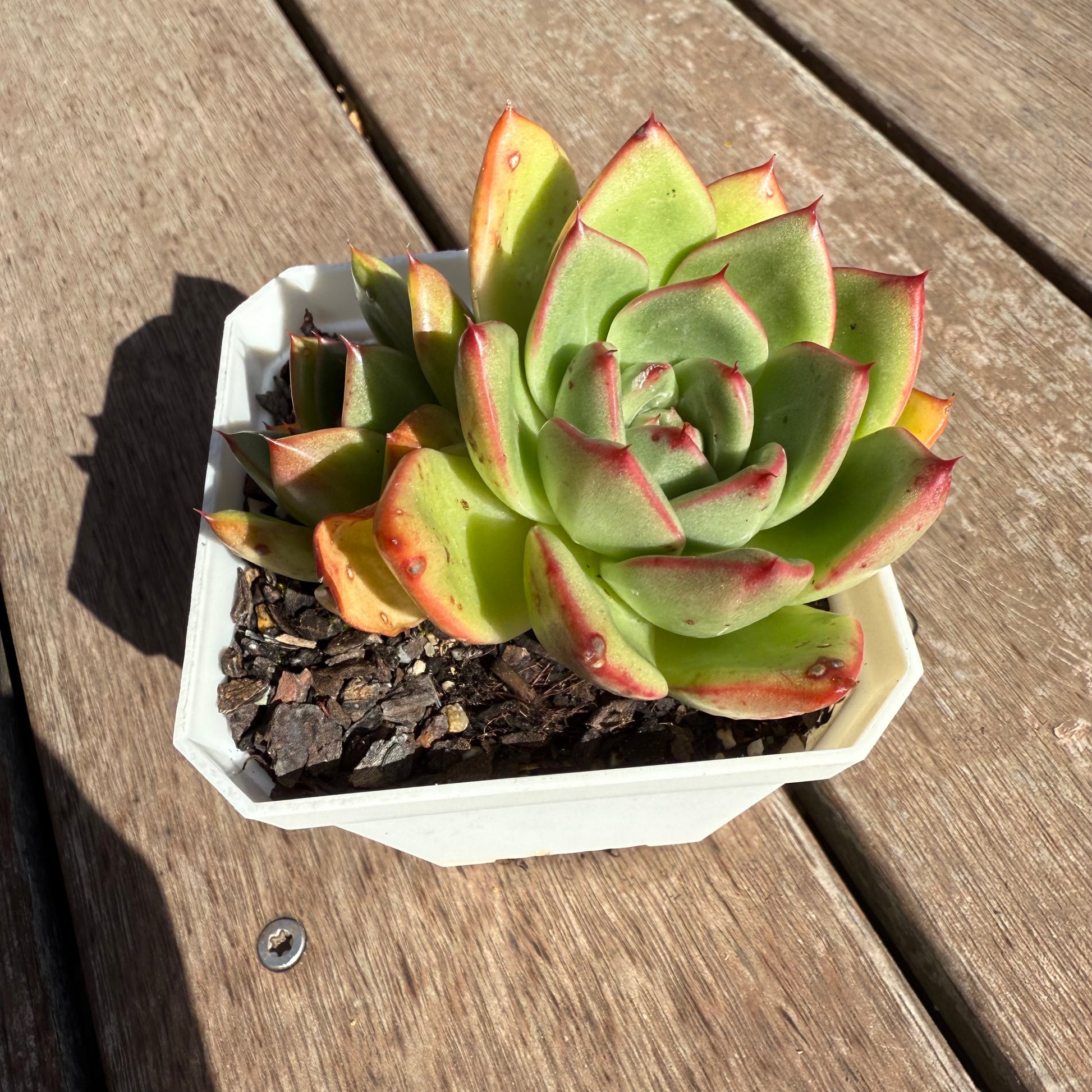 Red on the back and will form beautiful blood-like speckles when grown in full sun. Prefers full/partial sun.