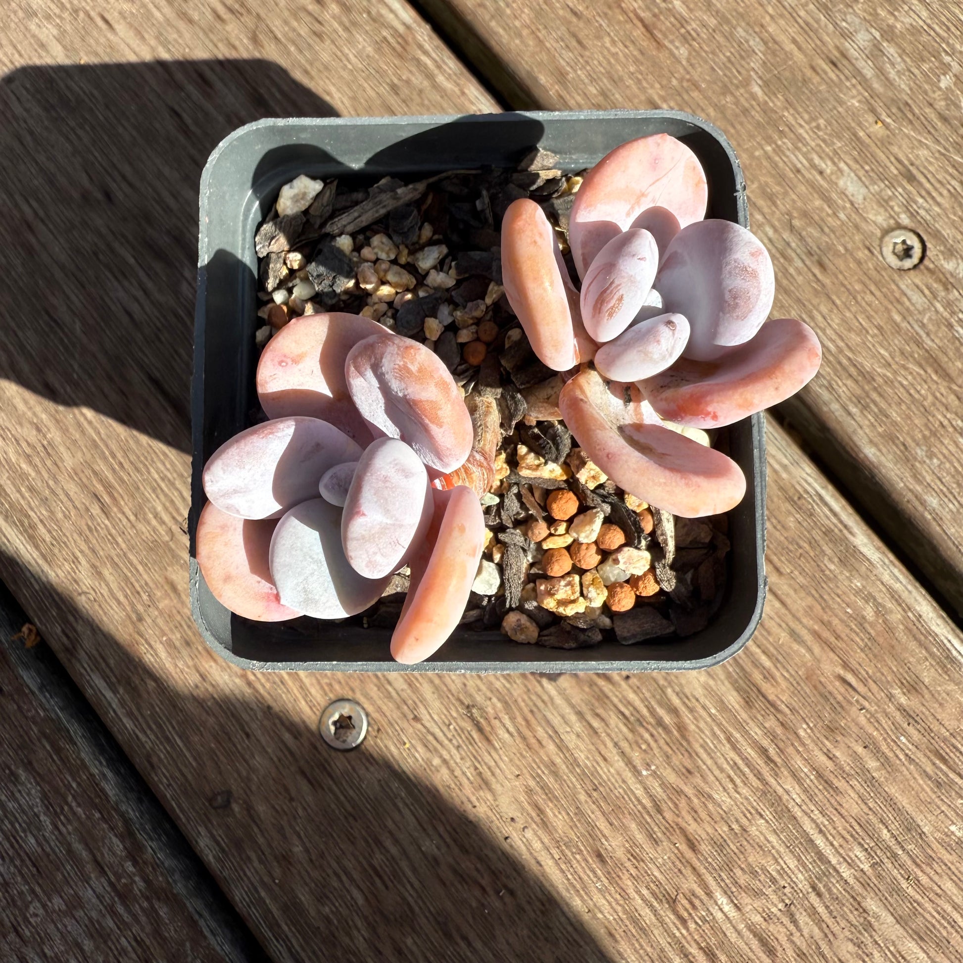 A hybrid of Graptopetalum amethytinum and Echeveria laui. Snow Peach has powdery oval leaves that blushes pink. An adorable variety to collect. Prefer full sun.