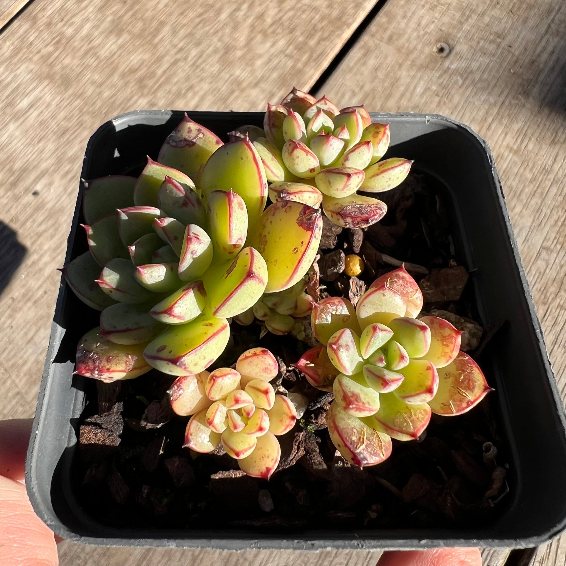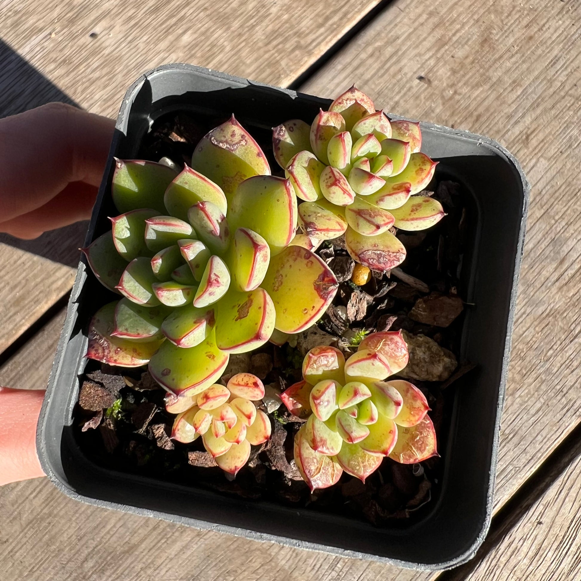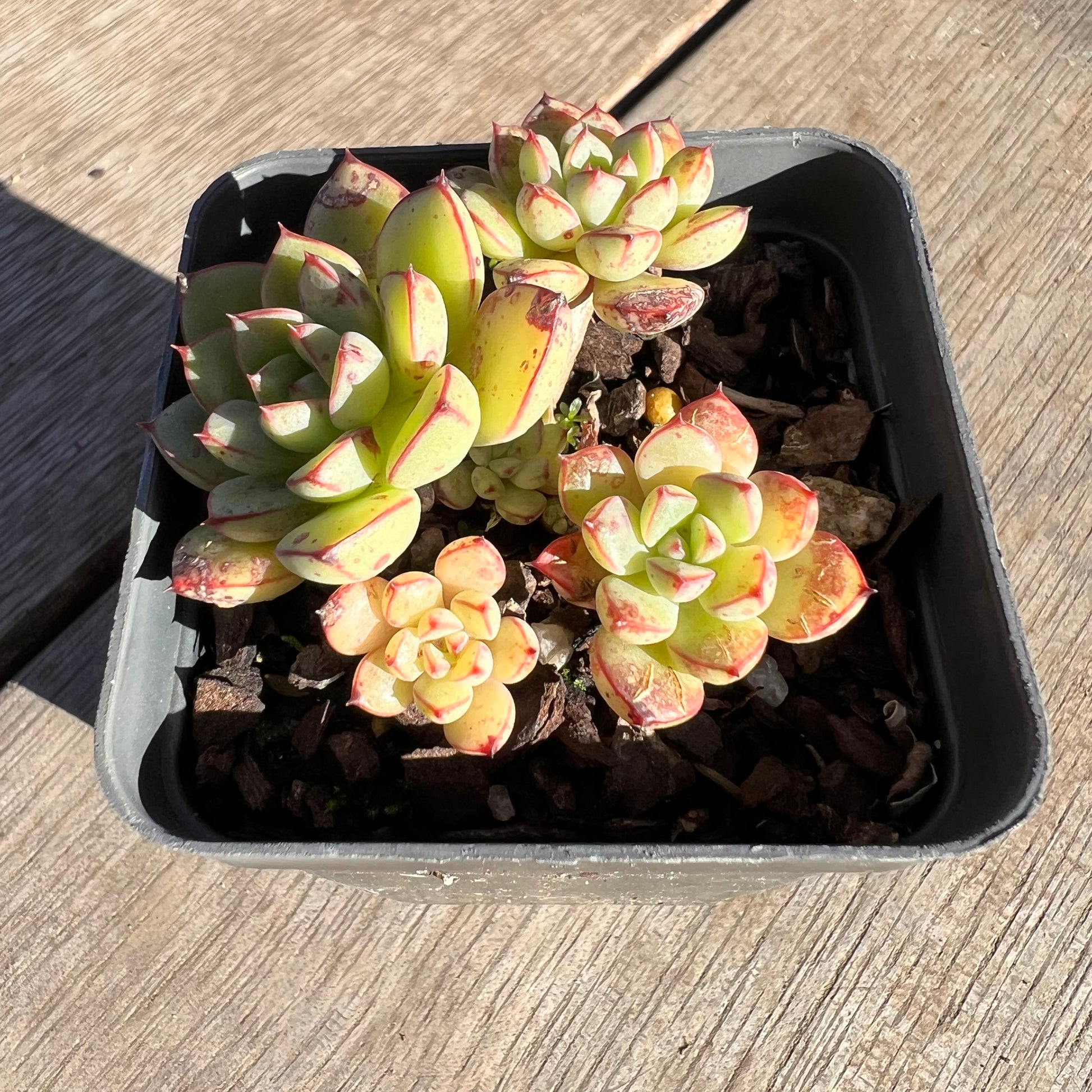 Echeveria Minima x Ballsii is a classic Echeveria, it has contrasting dark edges and pink center when stressed. They look very attractive when they form a clump and fill up a pot.