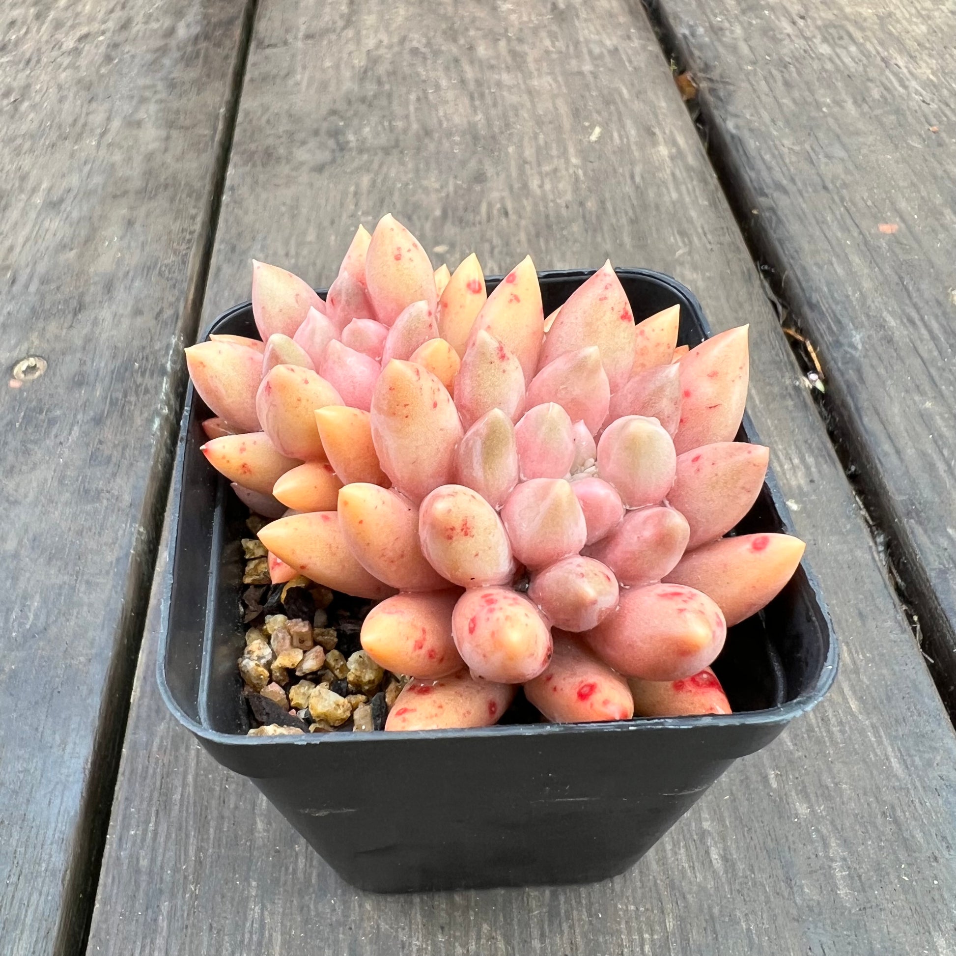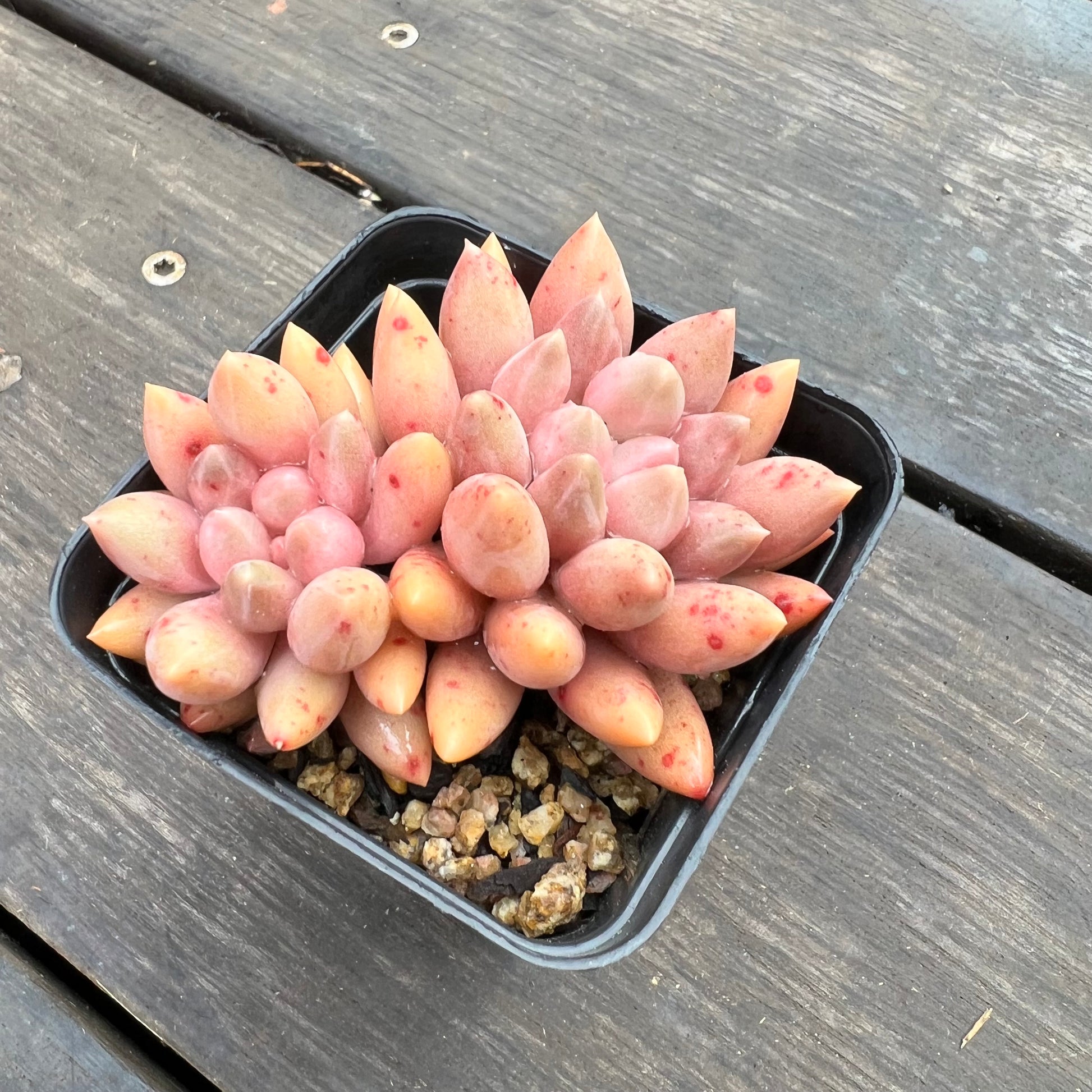 This is a classic variety with pointed grey-pink leaves that tips stress to bright pink when stressed. Prefers full sun.