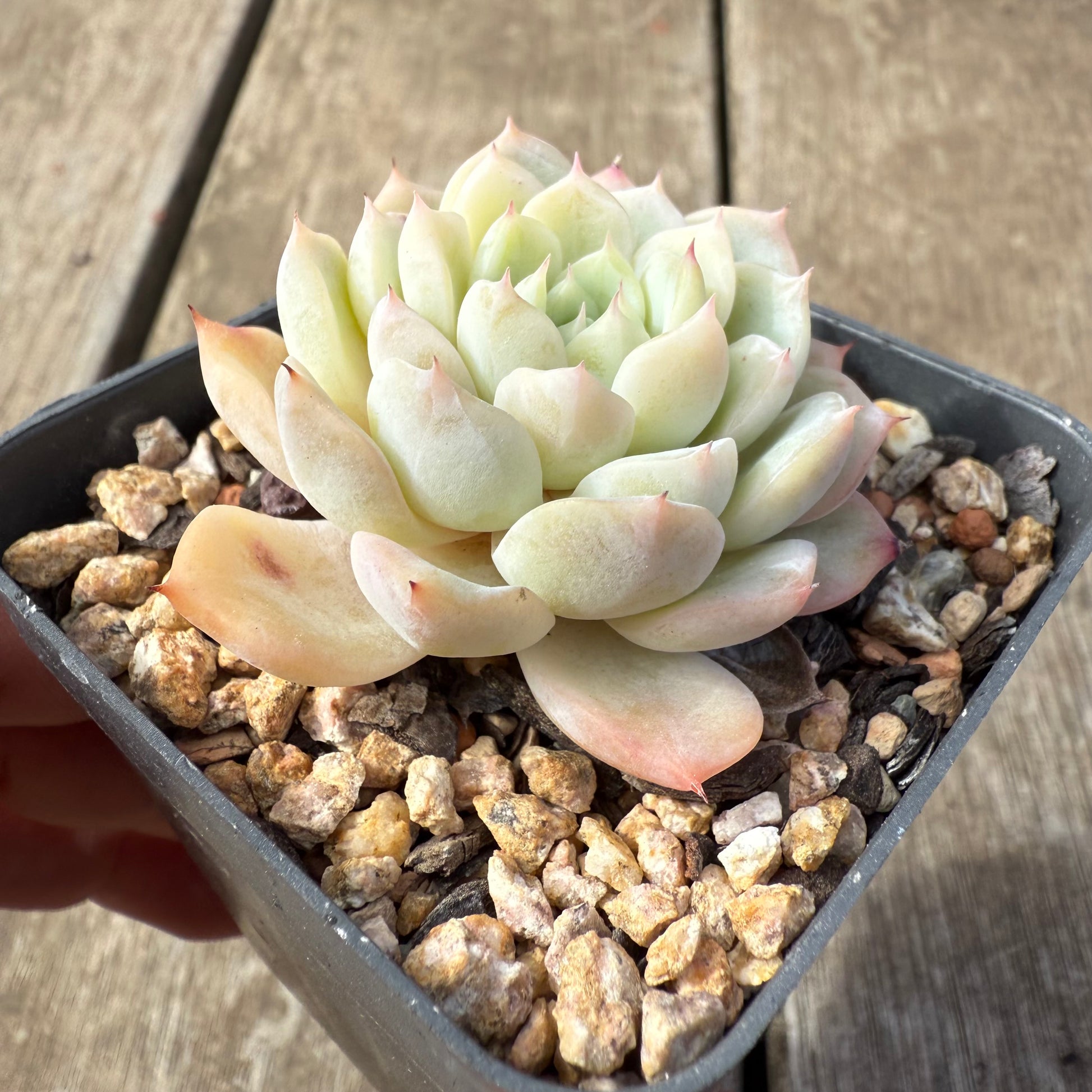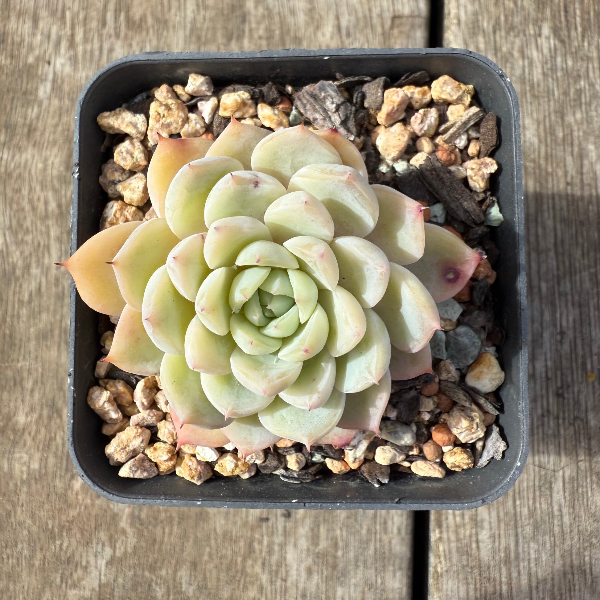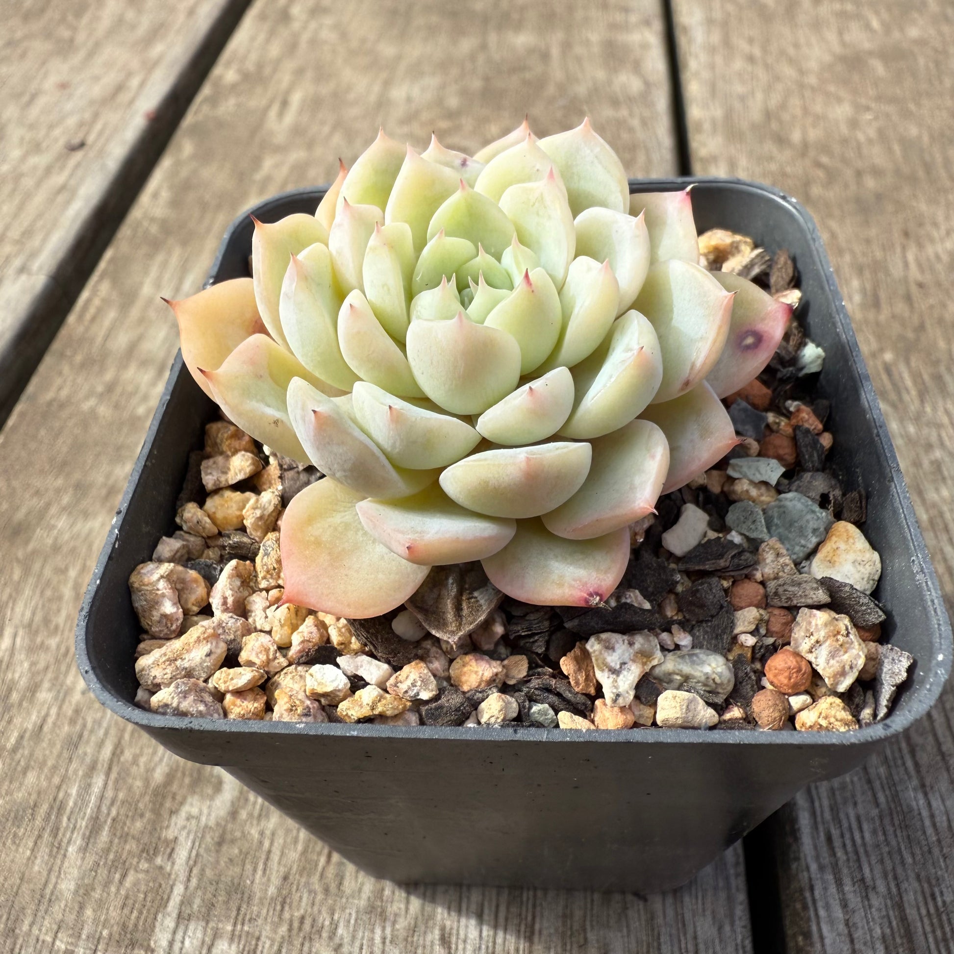 Echeveria 'Solitary' has lightly powdered leaves with a red sharp tip. Stress to form pink edges. Prefers full sun.