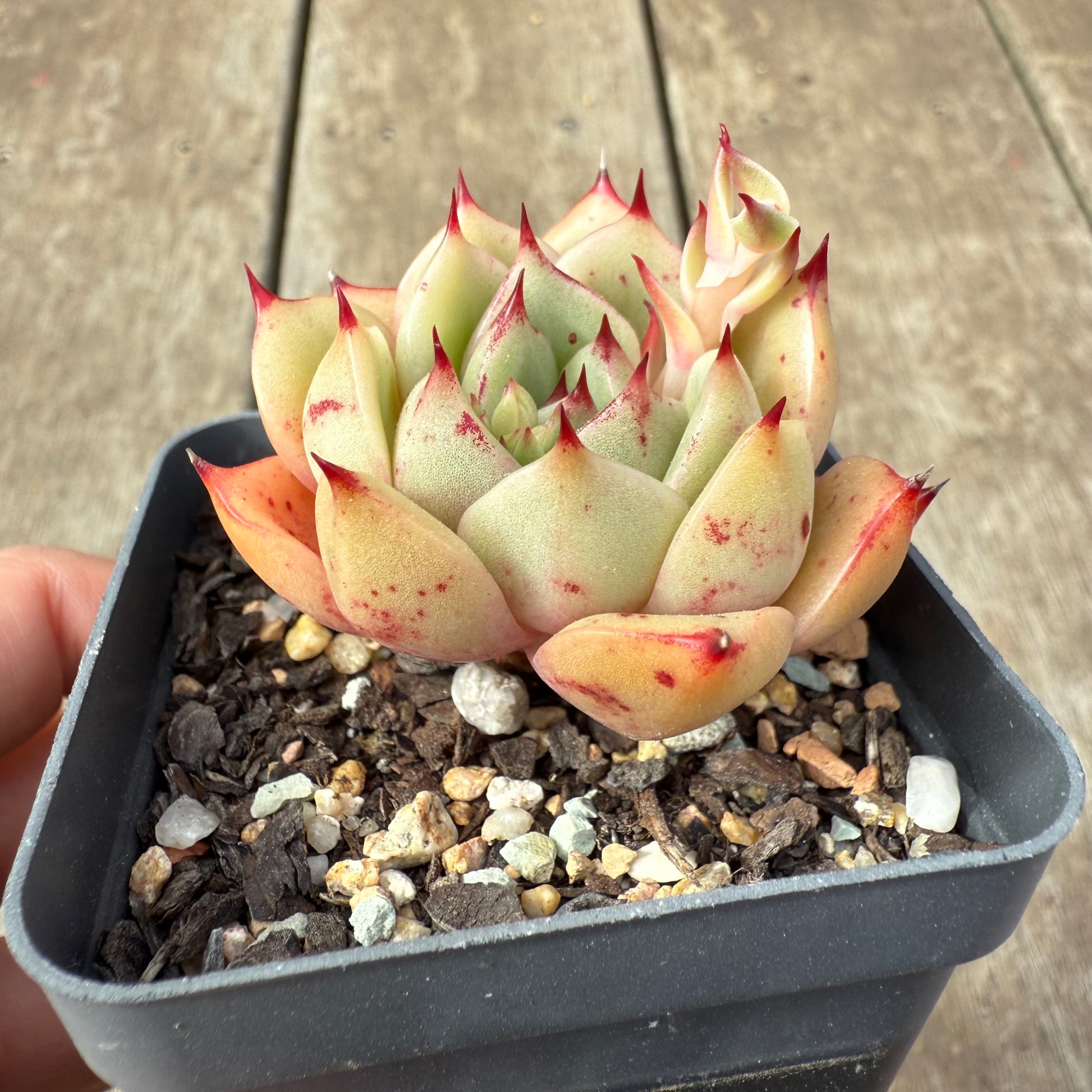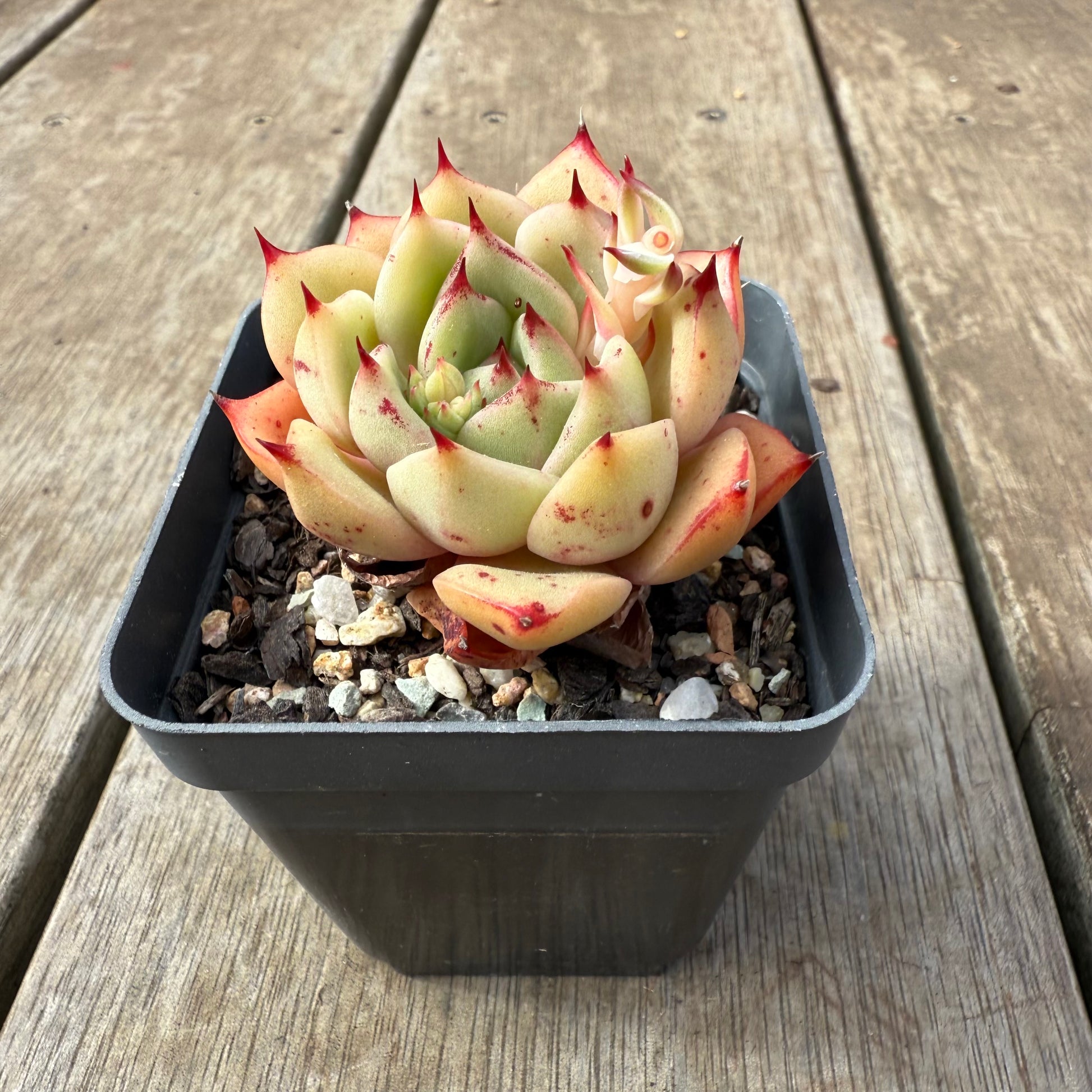 Echeveria 'Thorny Rose' has dark sharp tips on its leaves and forms a large compact rosette. Prefers full sun.