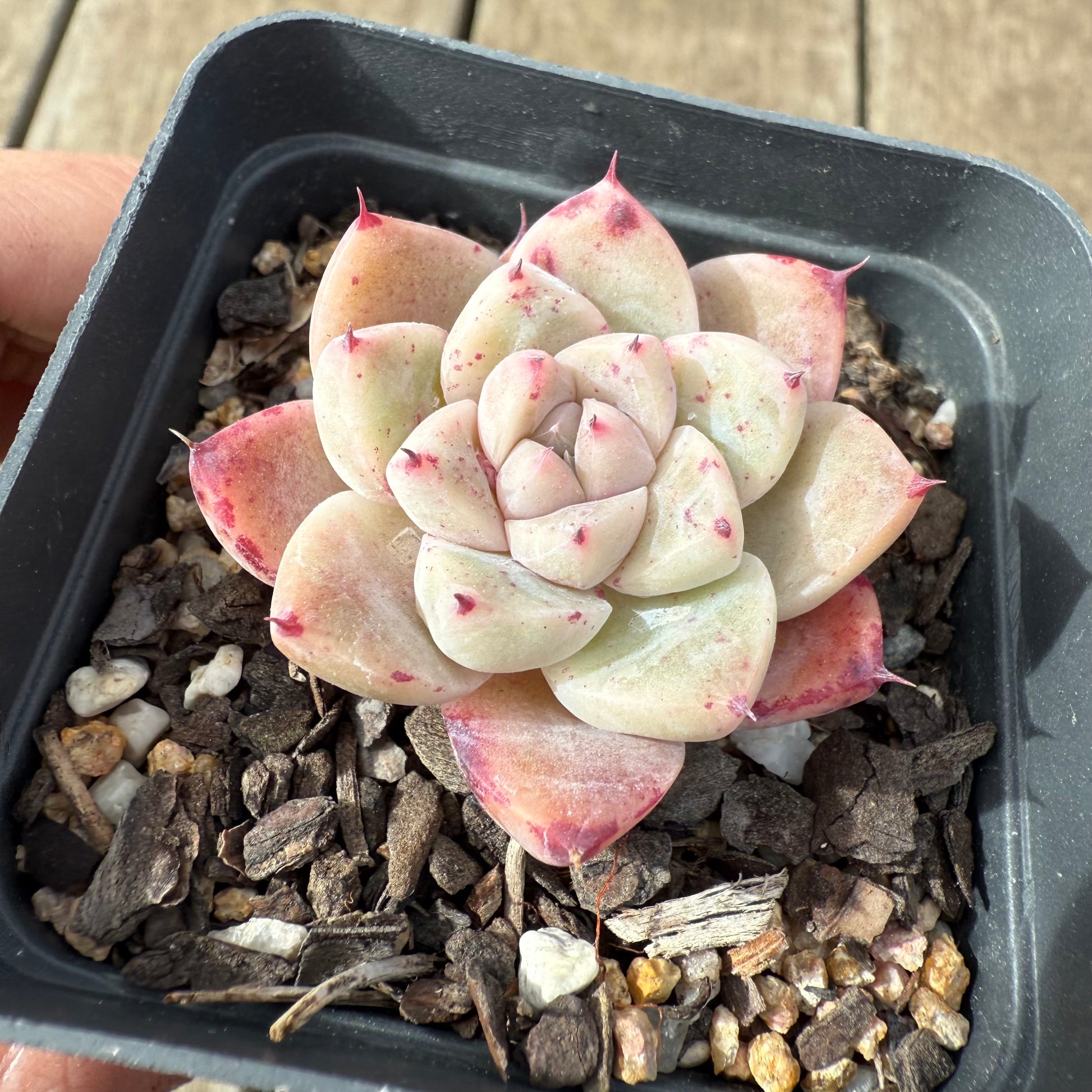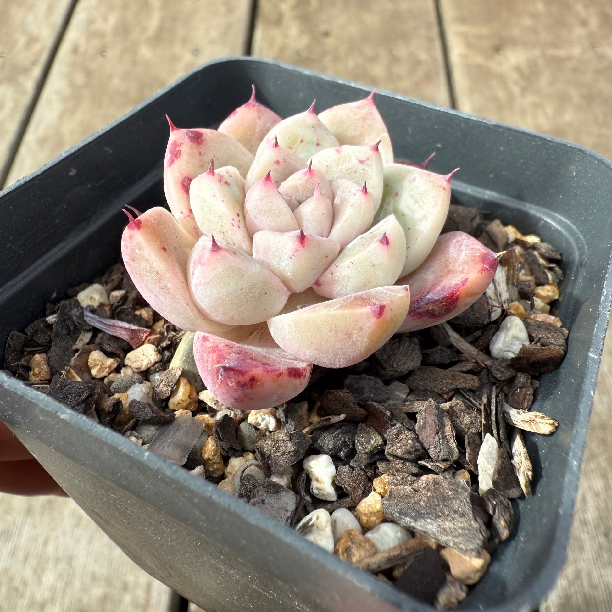 Echeveria 'White King' has pale white leaves and bright red tips. Stress to orange. Prefers full sun.