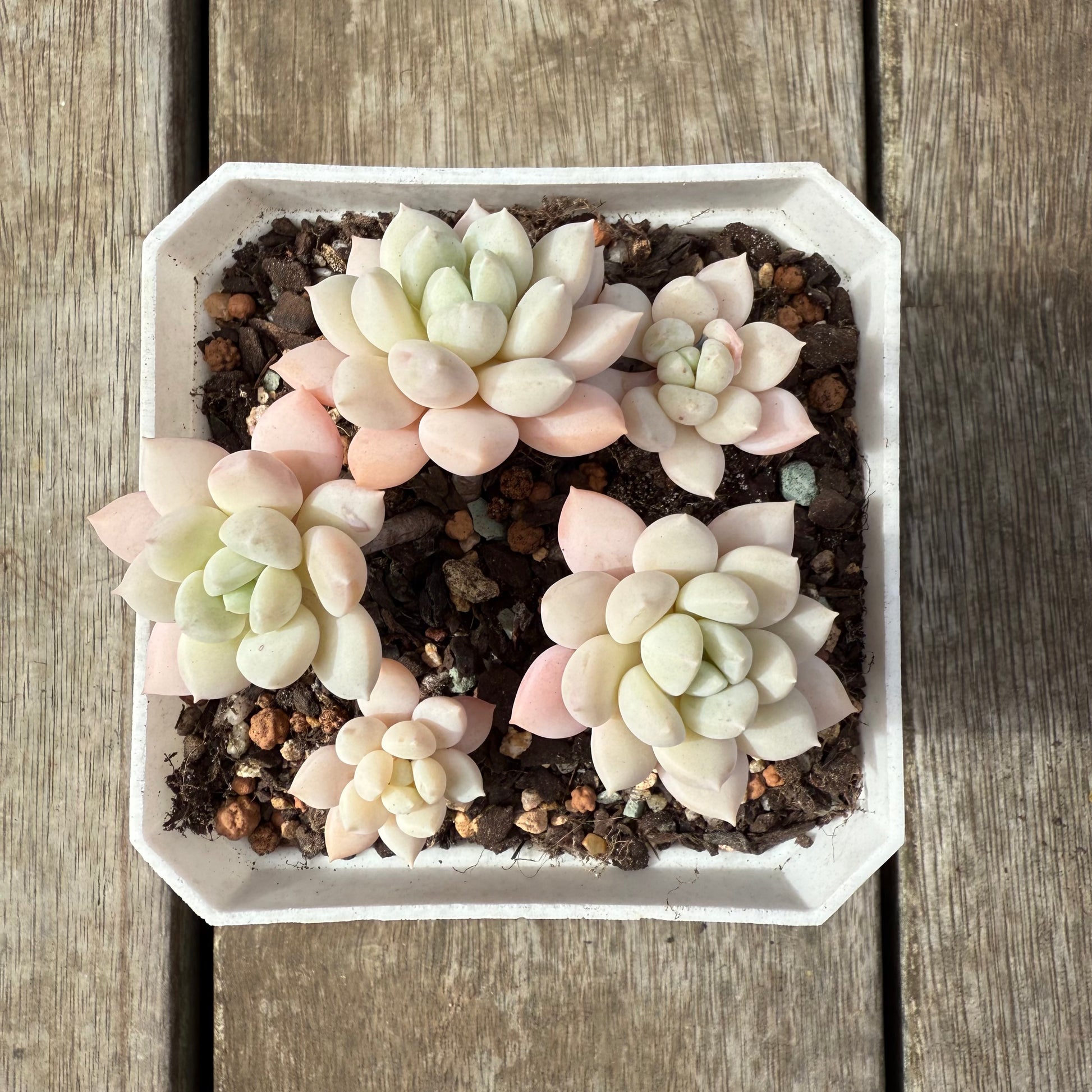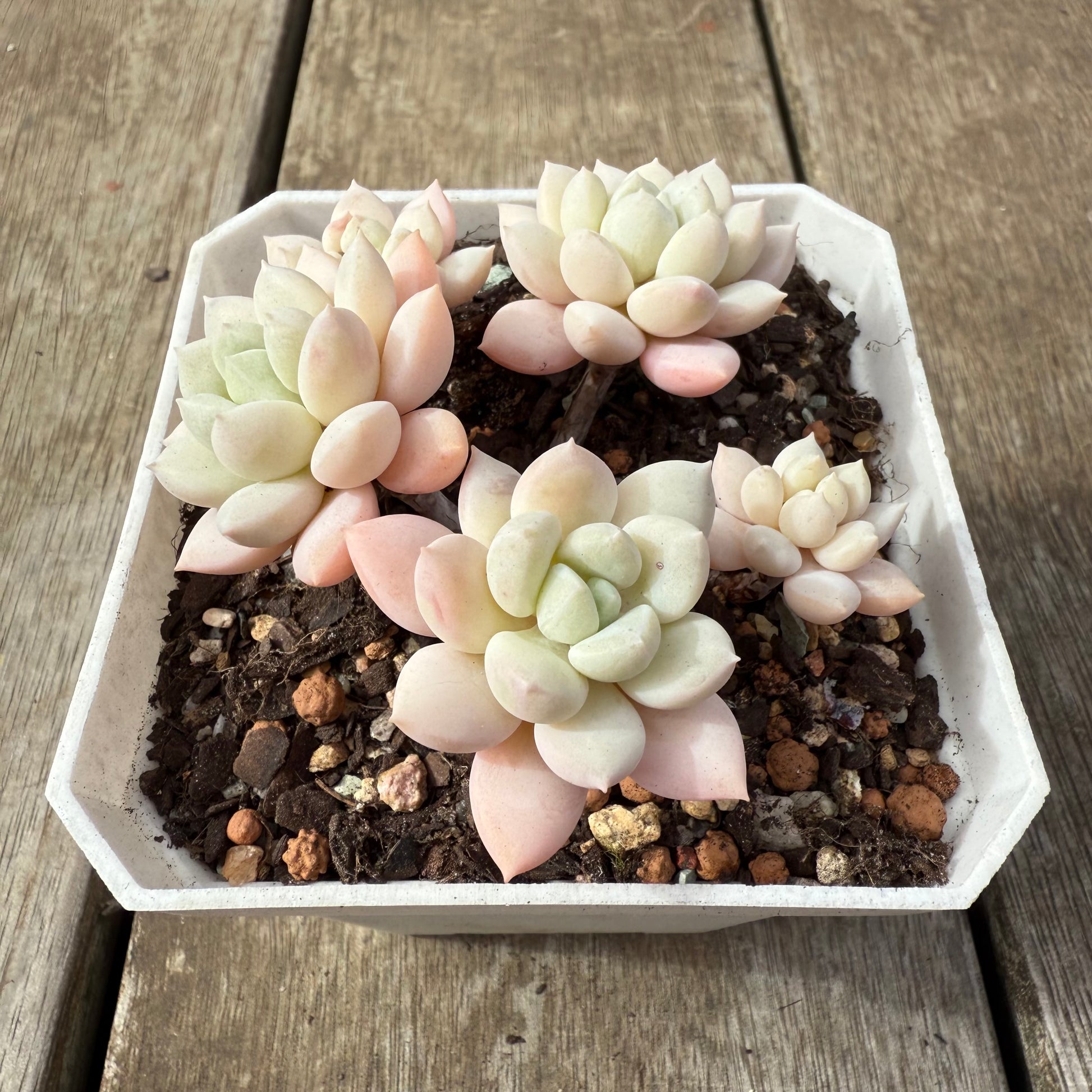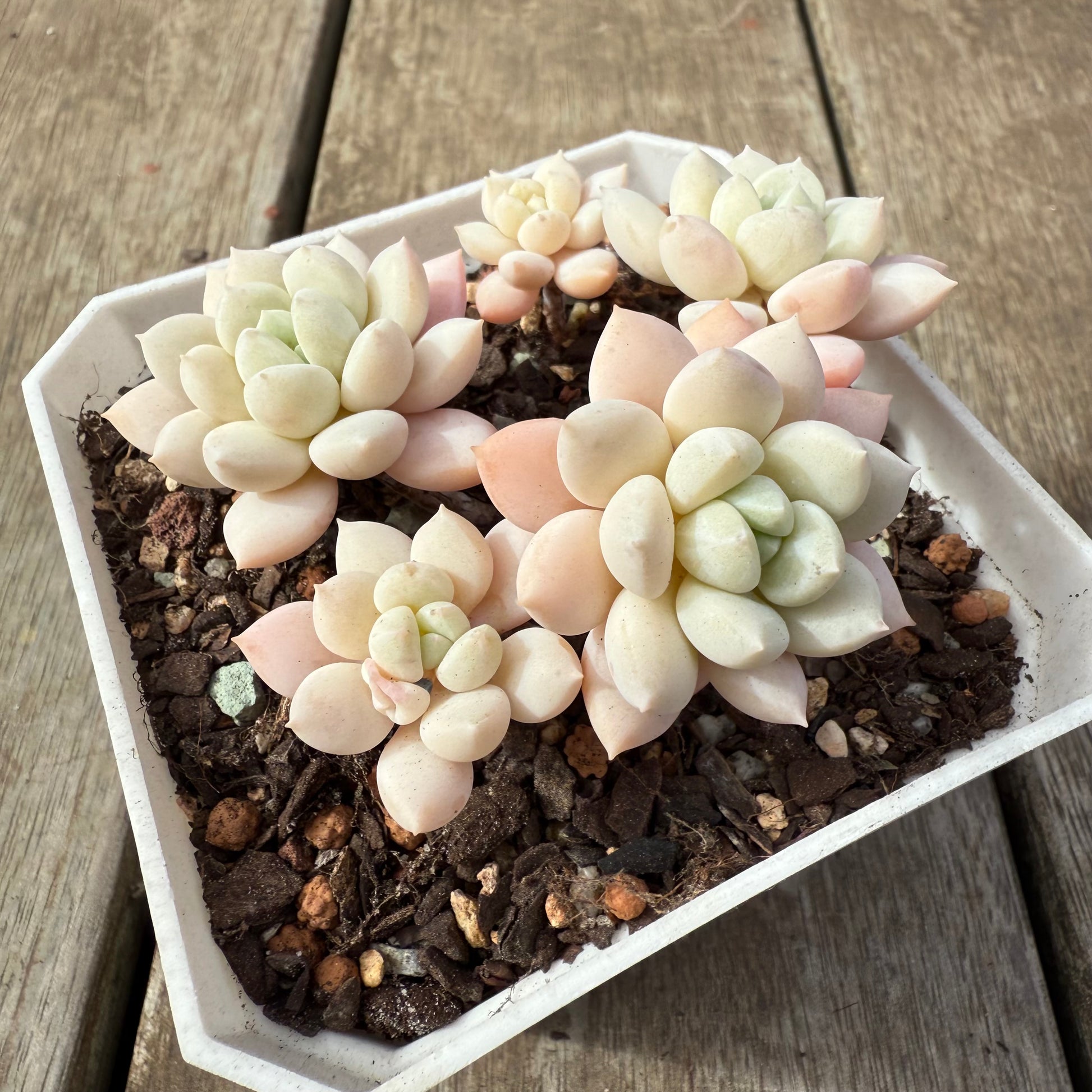 Graptoveria White Horse has chubby white leaves. This variety is similar to Sedeveria Pudgy, with more chubby and larger leaves. Prefer full sun.