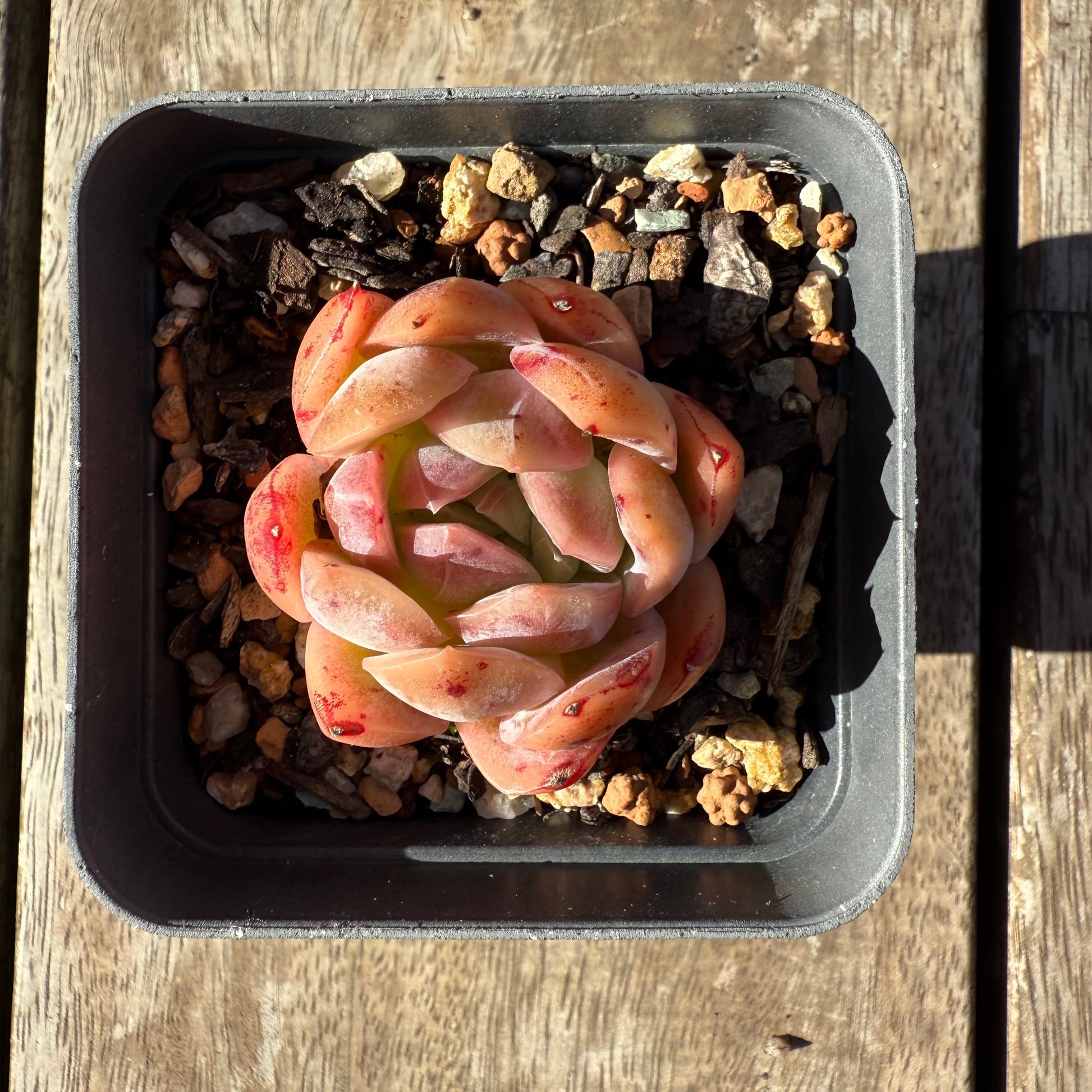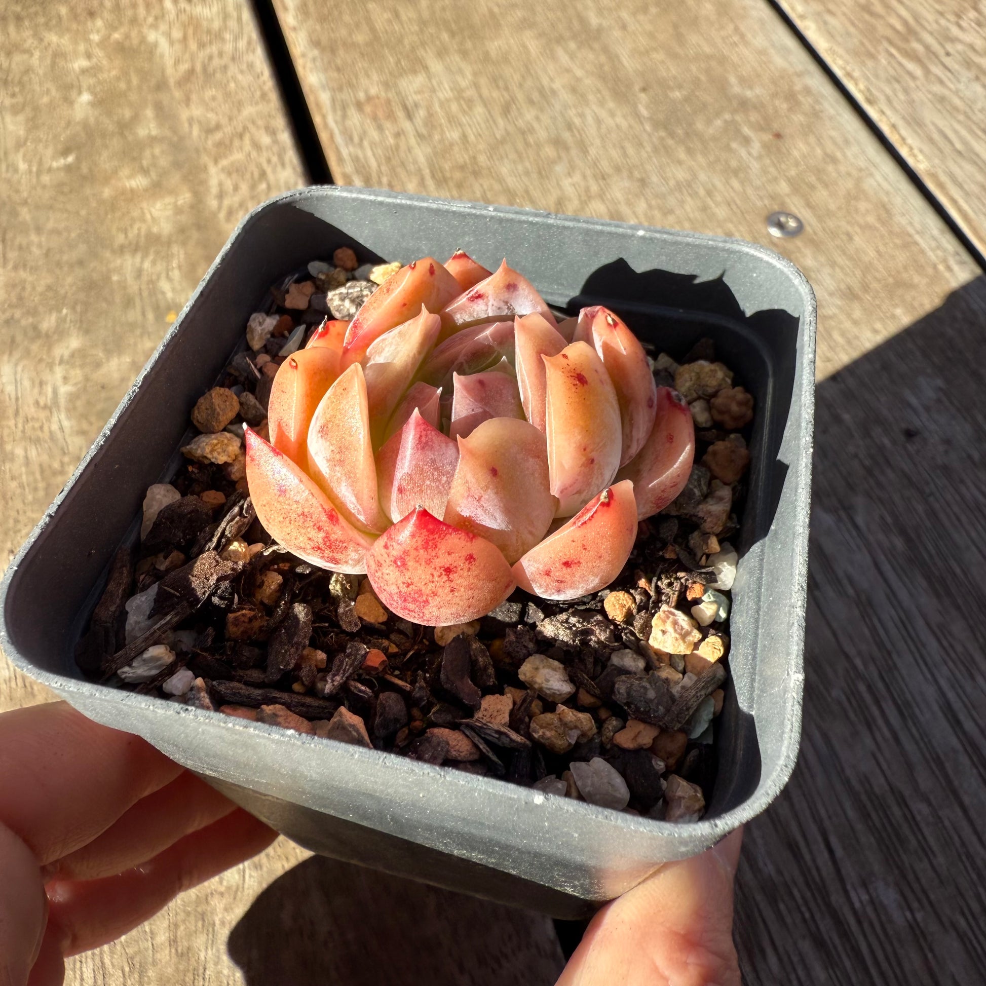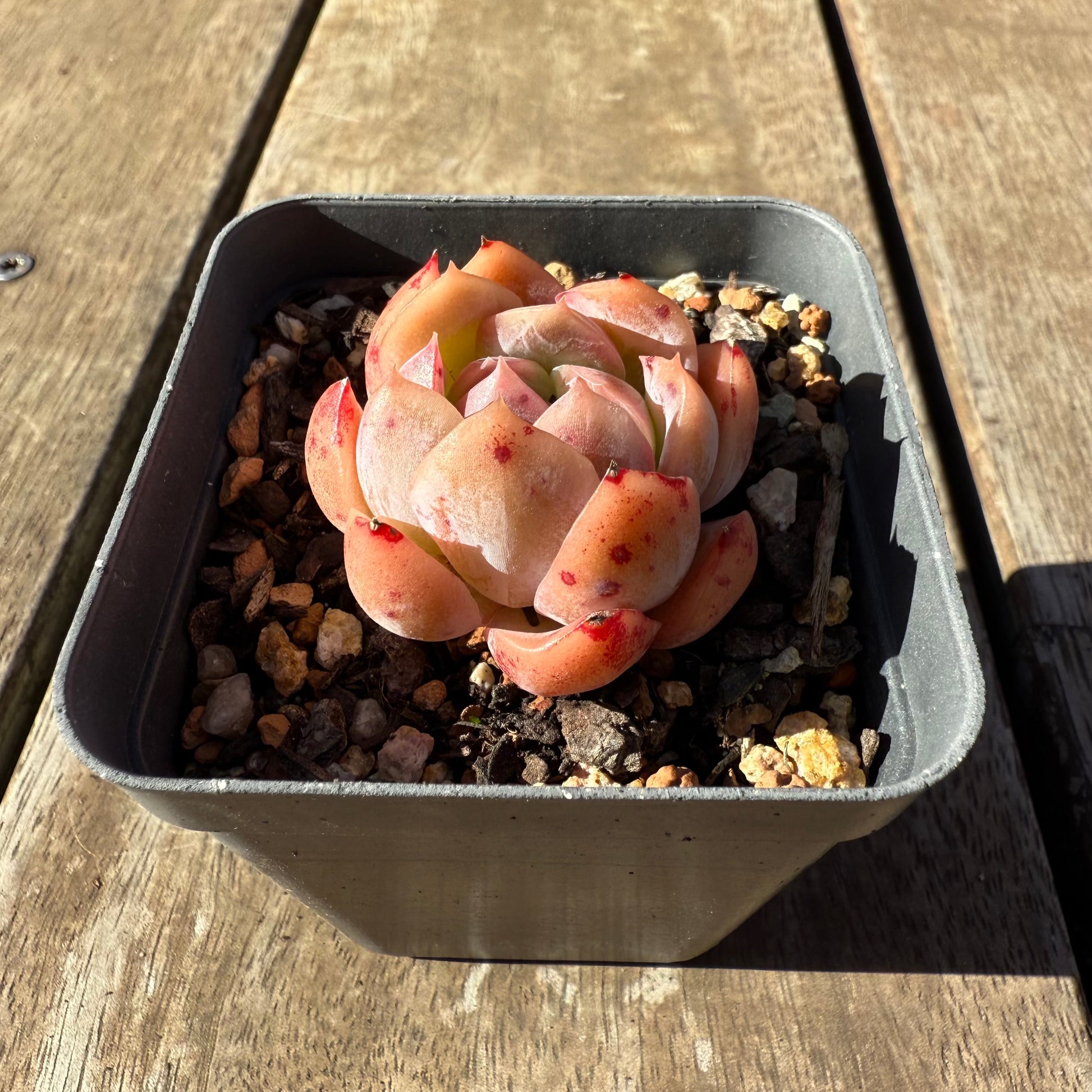 Echeveria Gala has orange/red waxy leaves. Stress to form red speckles. Prefer full sun.