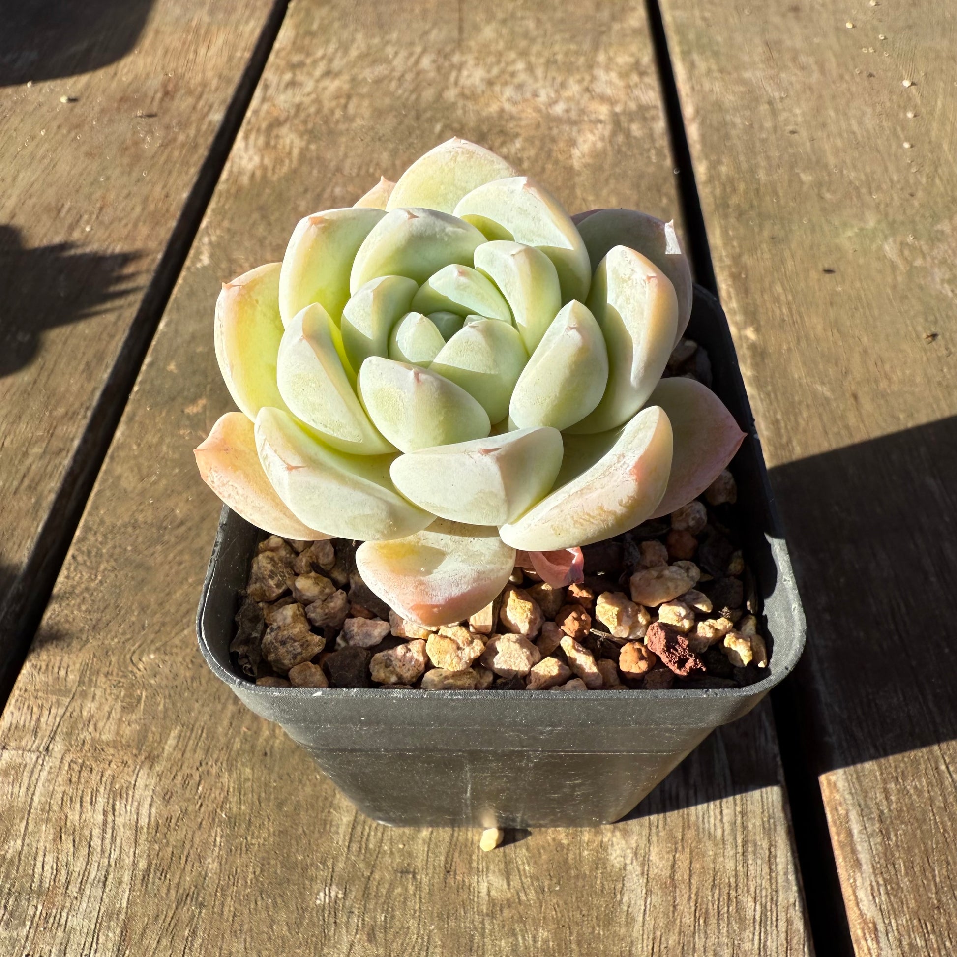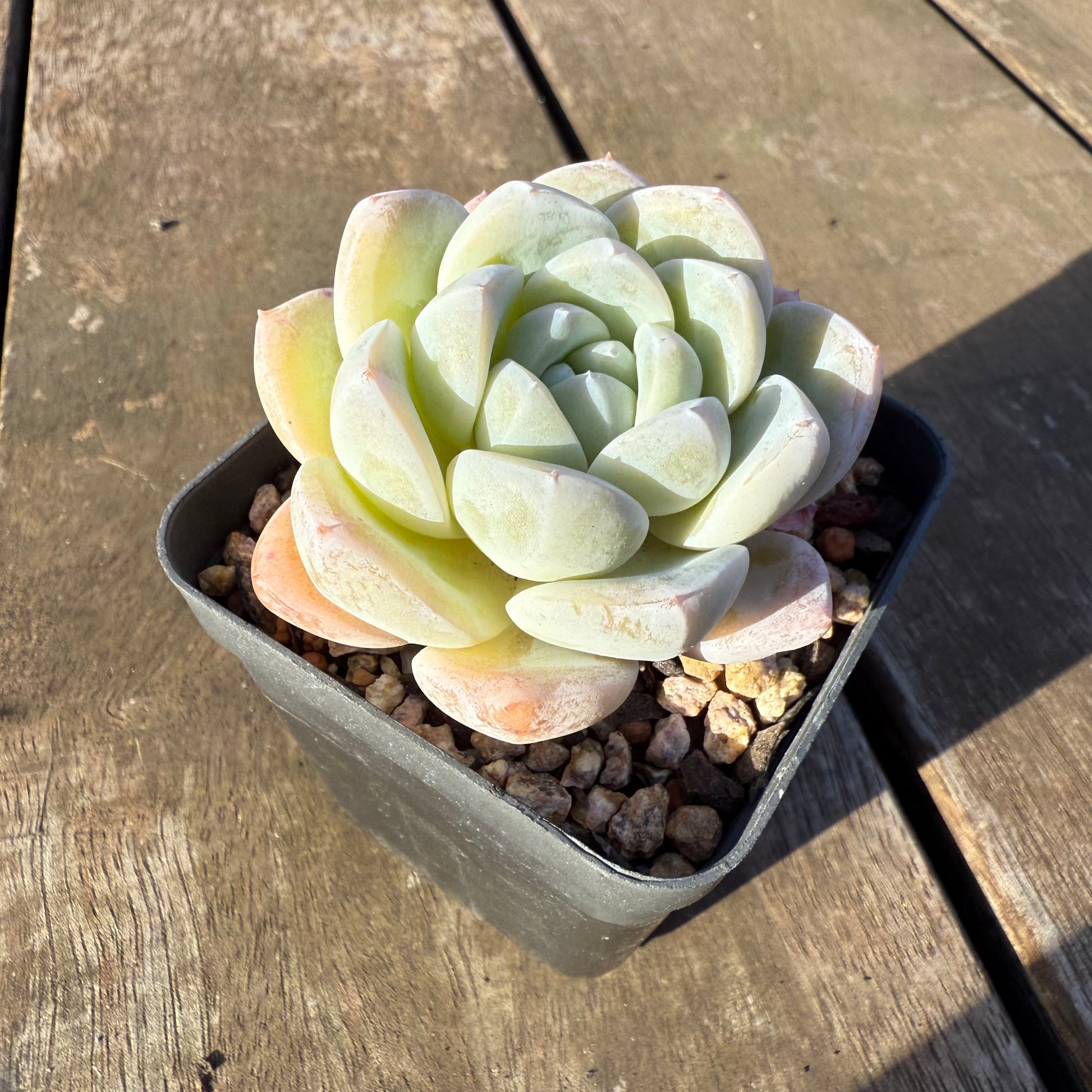 Echeveria 'White Shell' has triangular leaves with thick white powder. The back of leaves blush pink/orange when stressed. Prefers full sun.