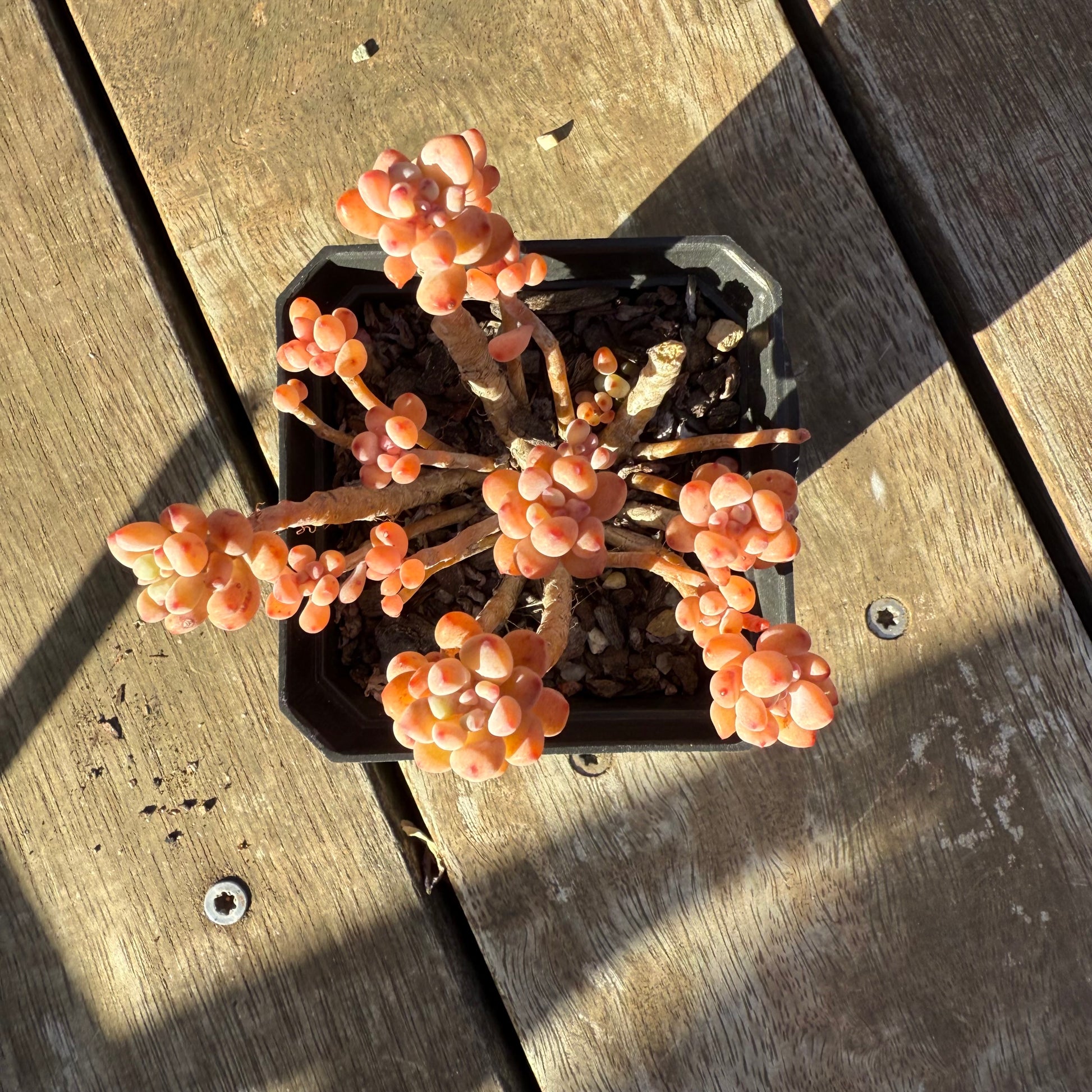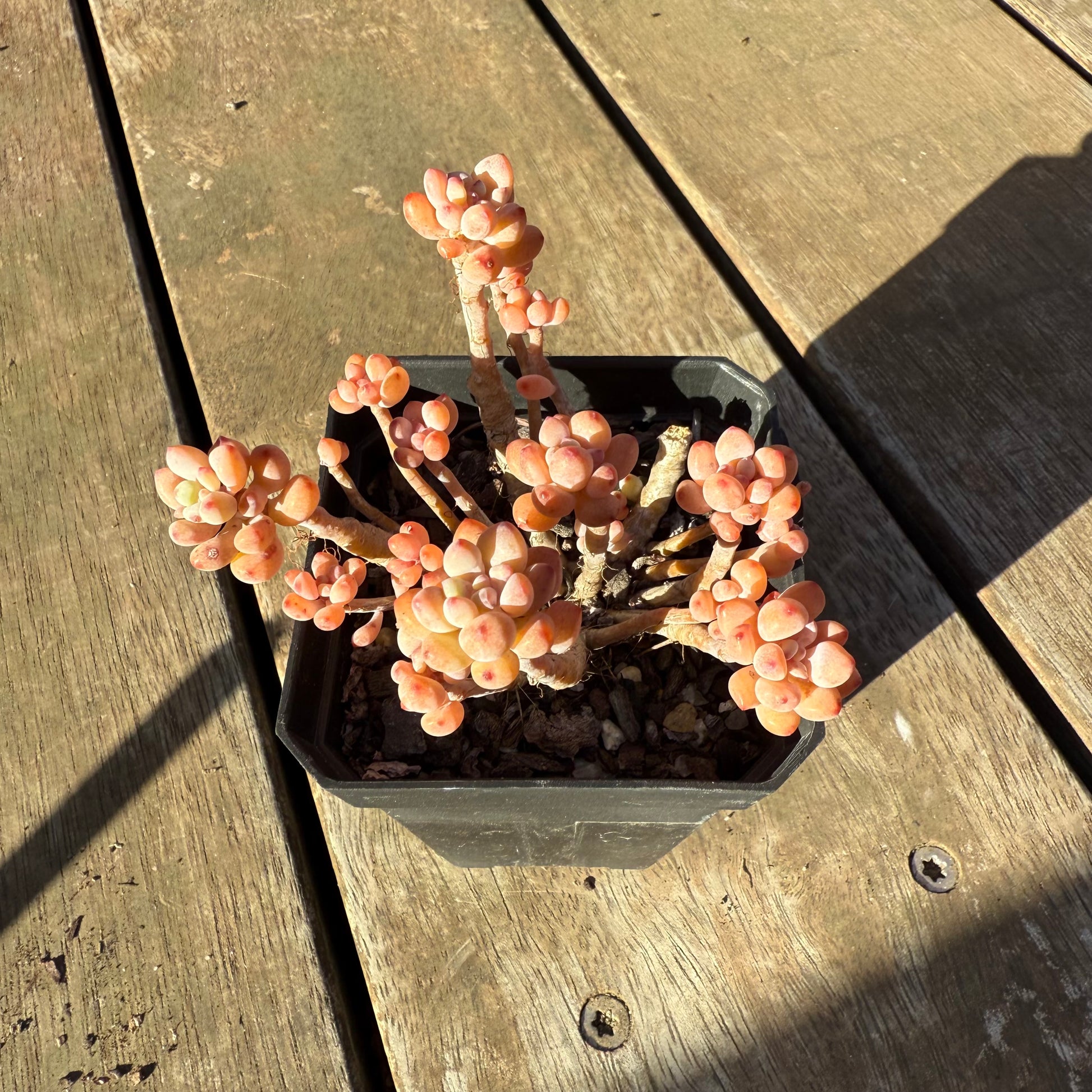 Graptopetalum Microcalyx has tiny light green leaves with soft pink/orange on the tips. She offsets a lot and will stress to orange. Prefers full/partial sun.