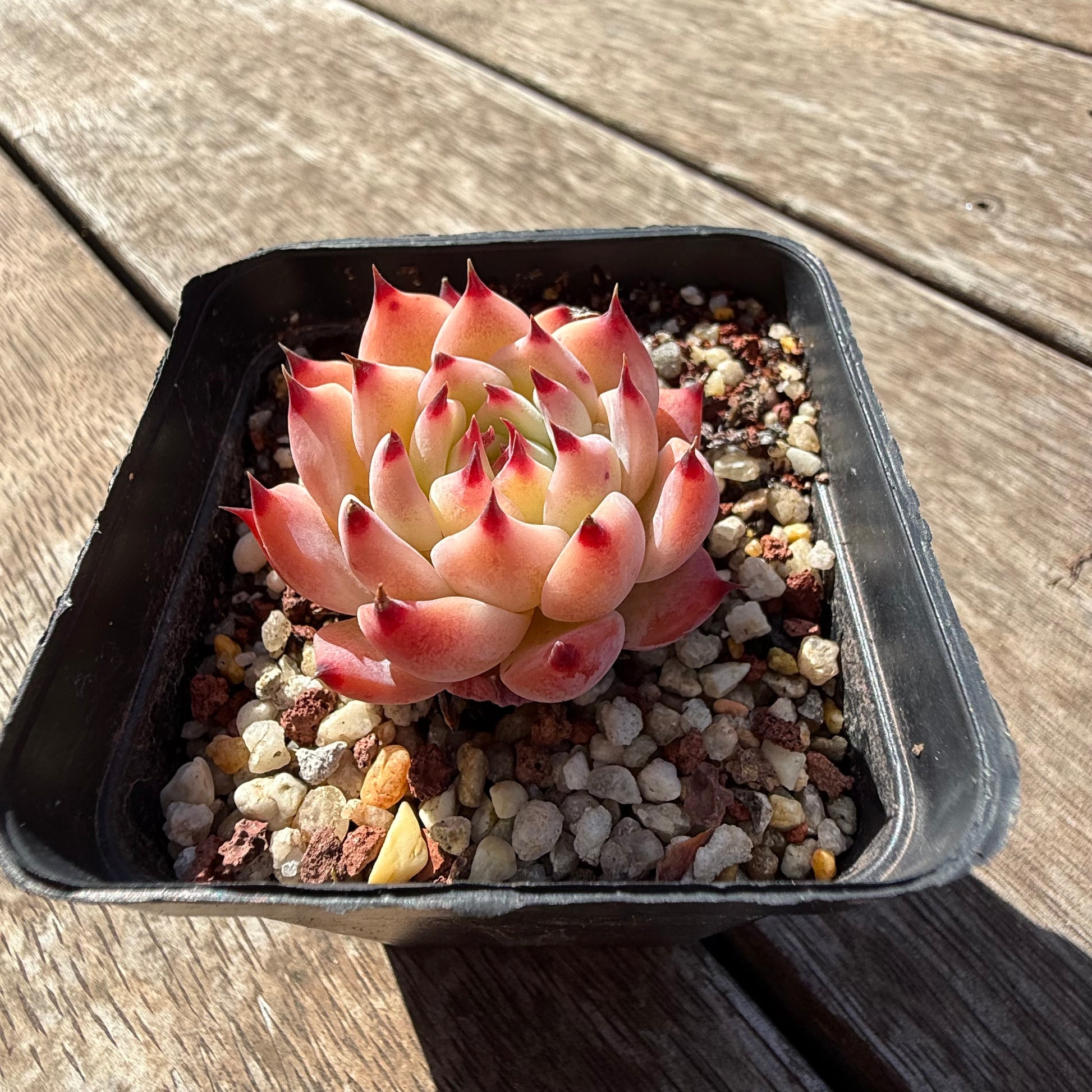 Echeveria Peach Boy is a hybrid of E. Chihuahuensis. It has bright red tips and stress to red. Prefers full sun.