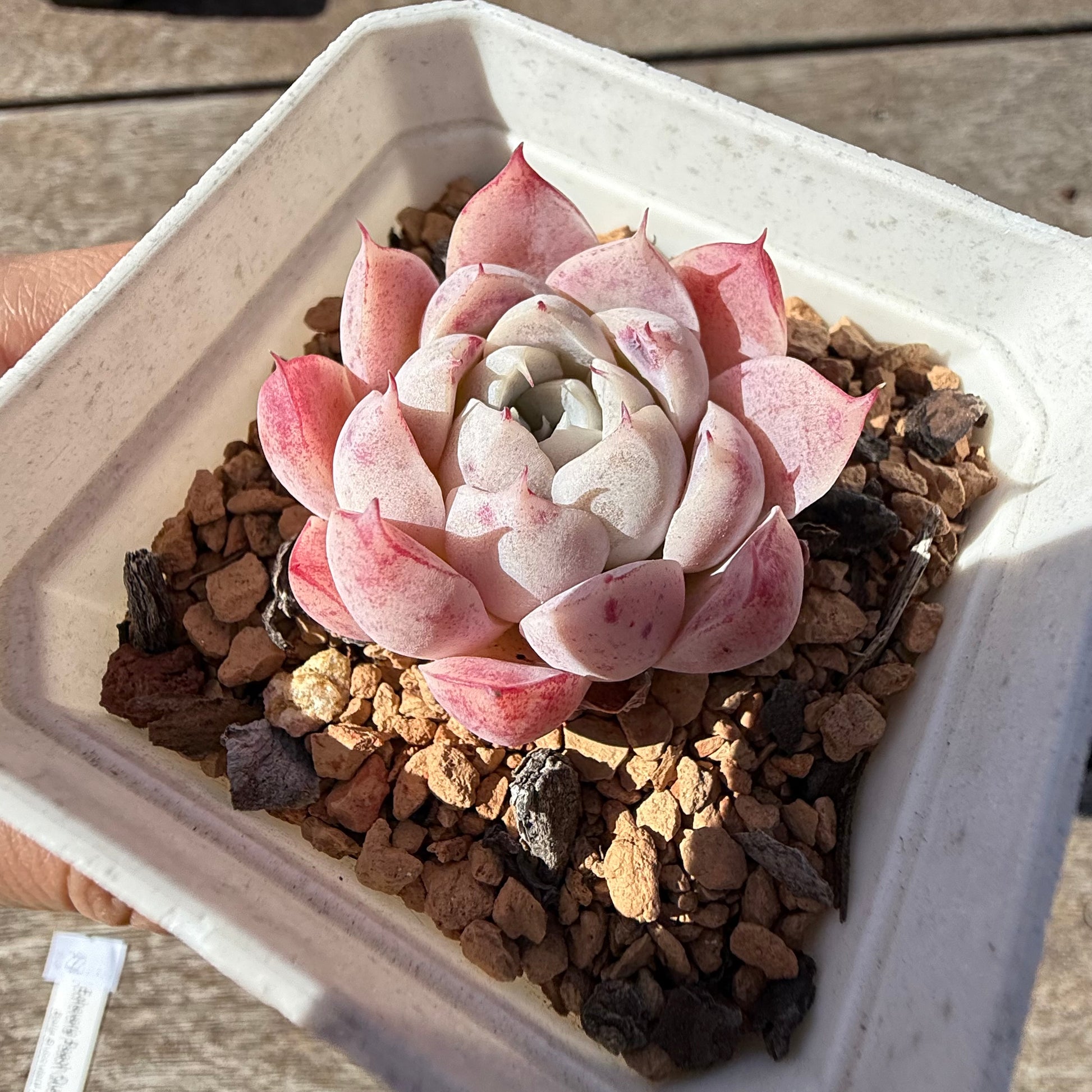 Echeveria 'Peach Queen' has pink leaves and pink speckles formed on its outer leaves. Prefers full sun.