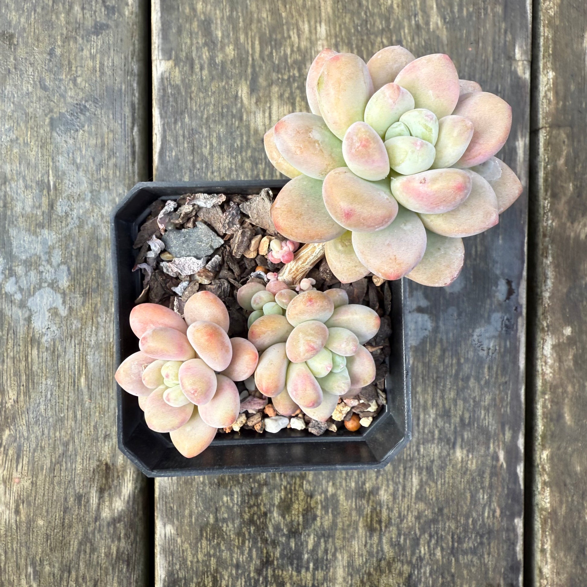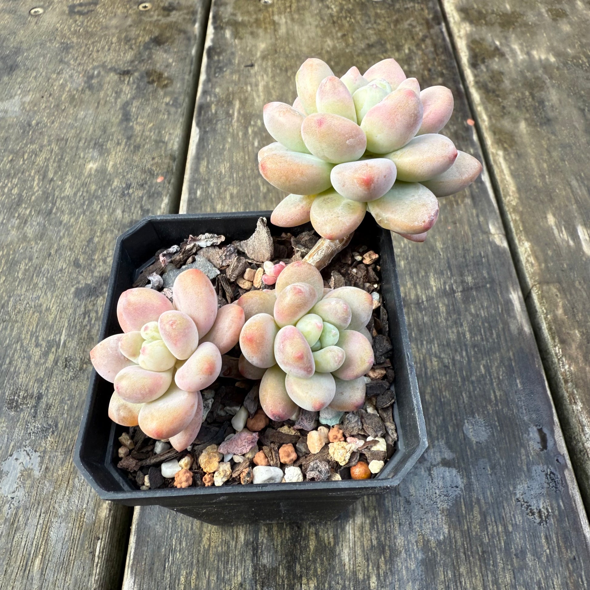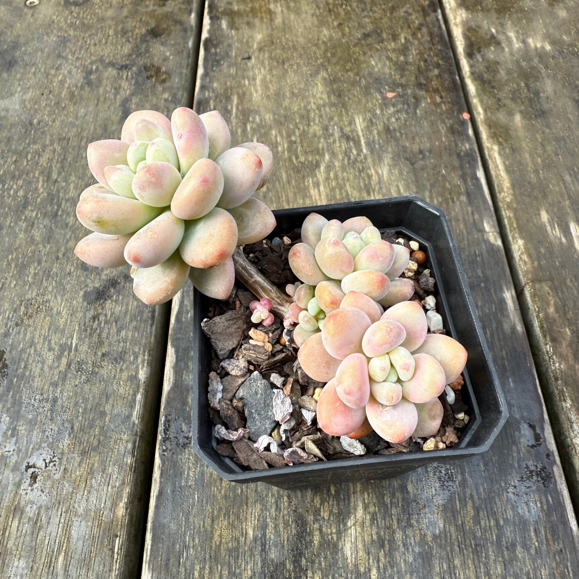Pachyveria 'Elaine Reinelt' has chubby rounded leaves, stress to soft pink/orange. Prefer full sun.