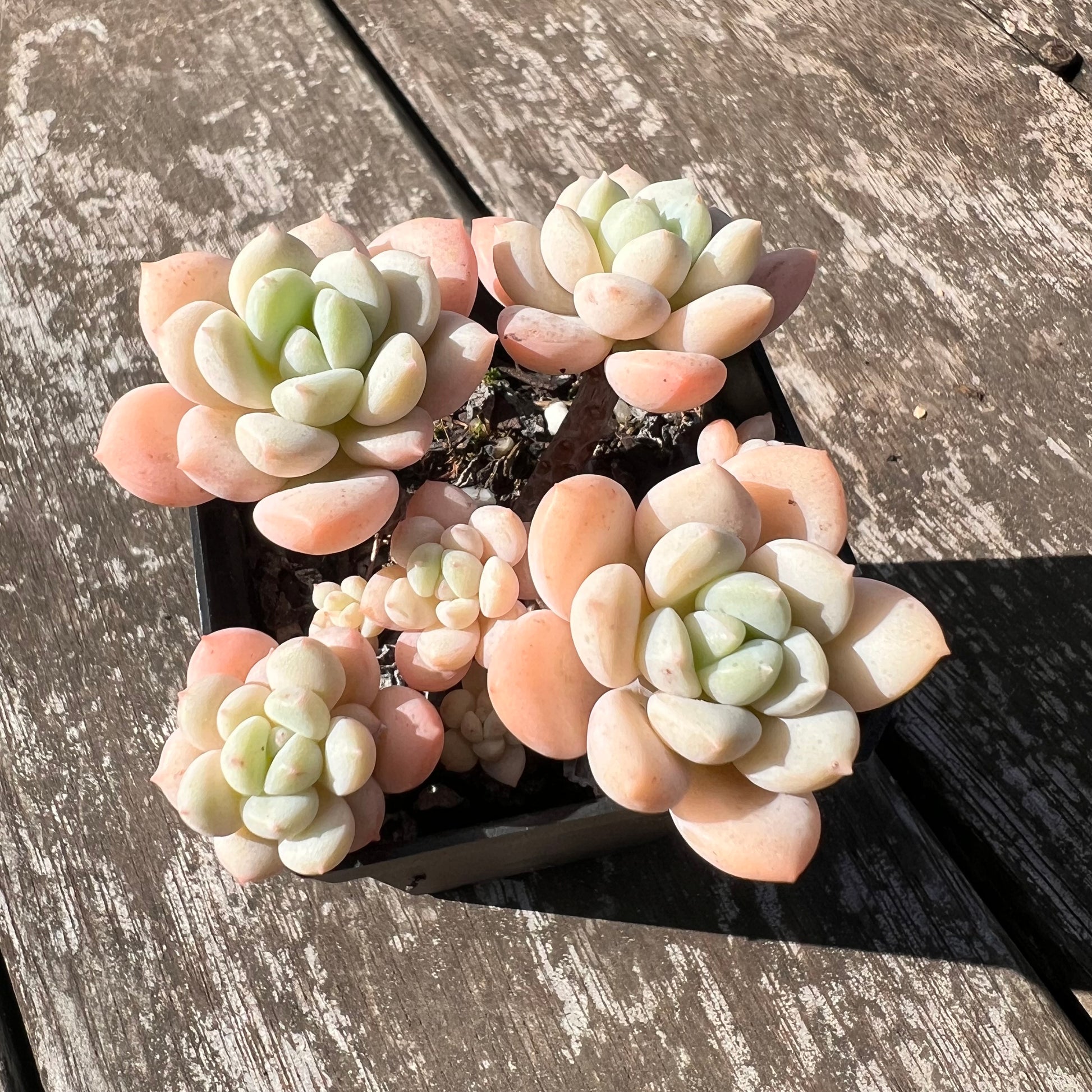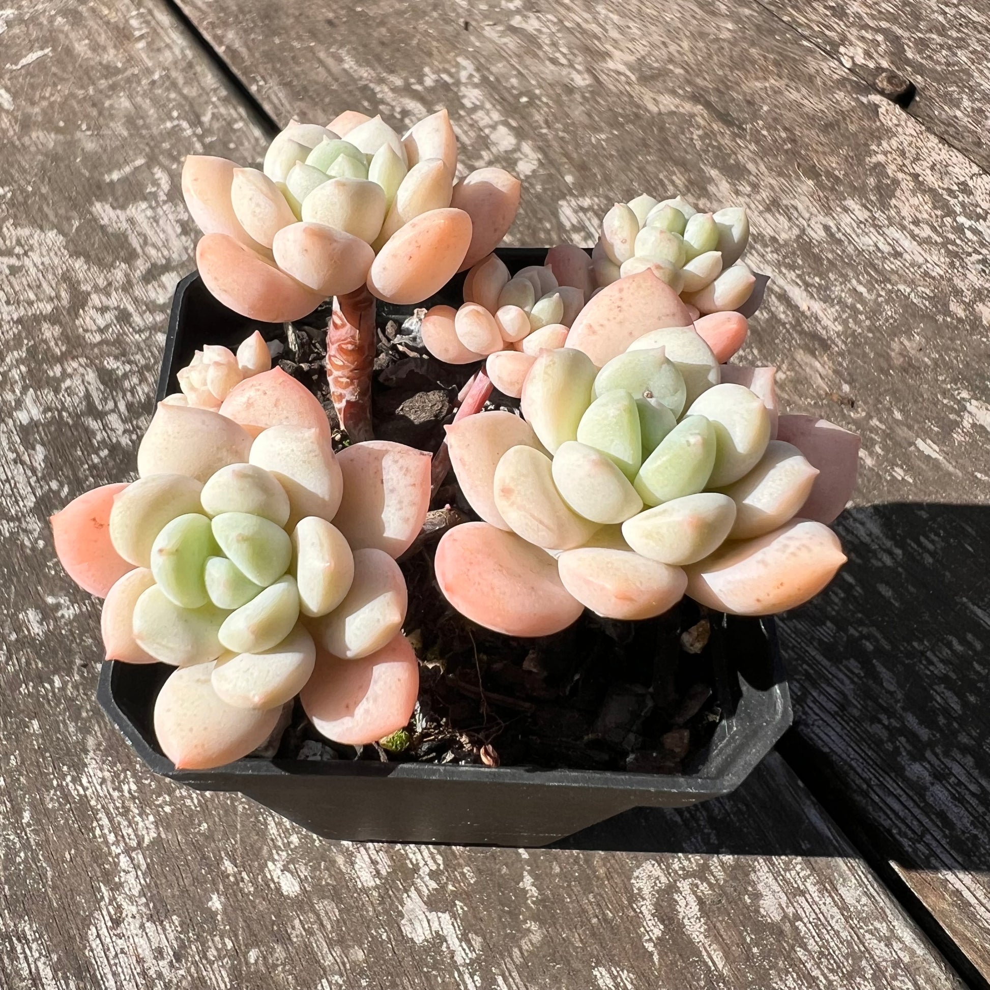 Sedeveria Pudgy is a classic round and chubby hybrid between sedum and echeveria. It offsets easily. Prefers full/partial sun.