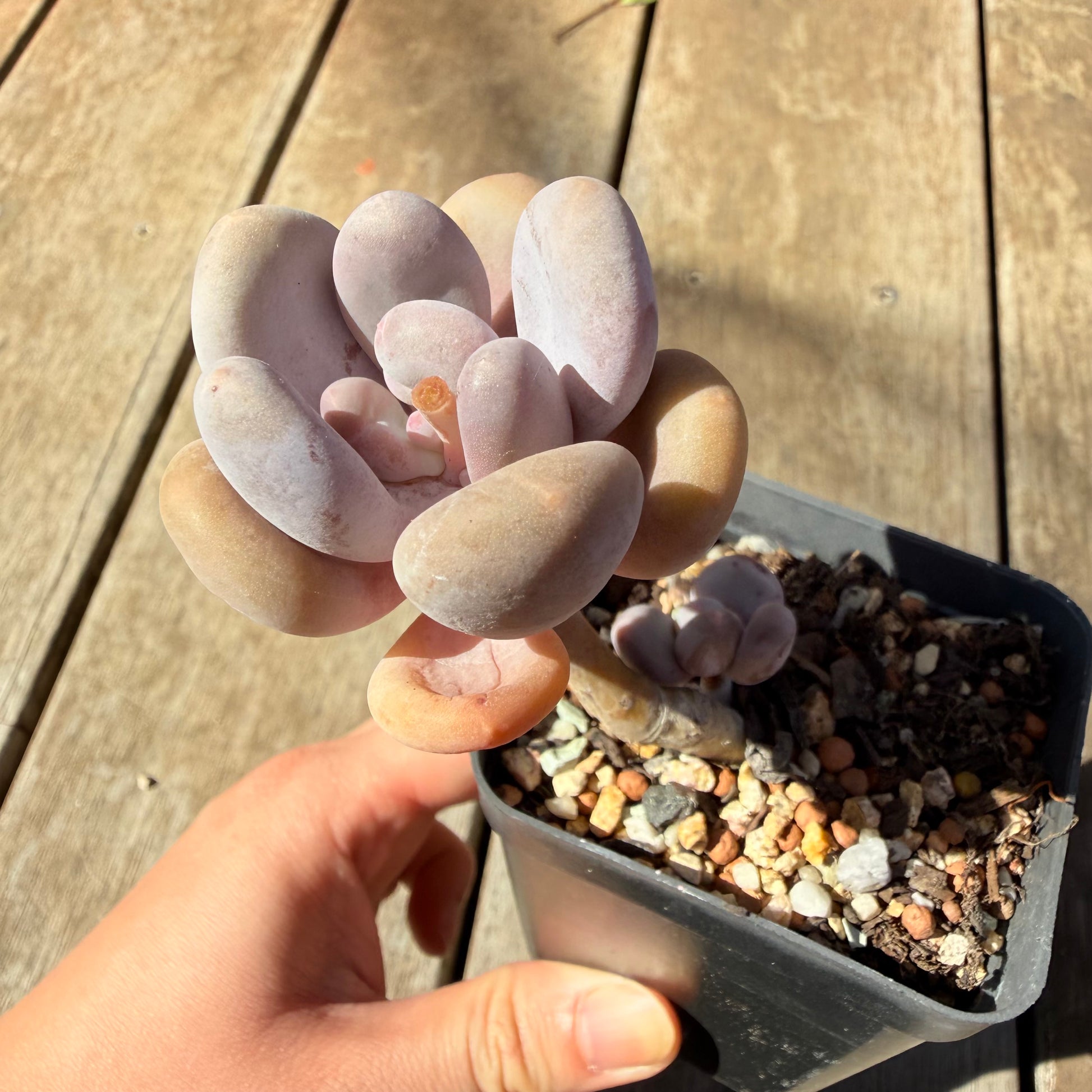 Pachyphytum Glutinicaule has powdery oval shaped leaves, with a pointy pink tip. Stressed to pink. Prefers full sun.