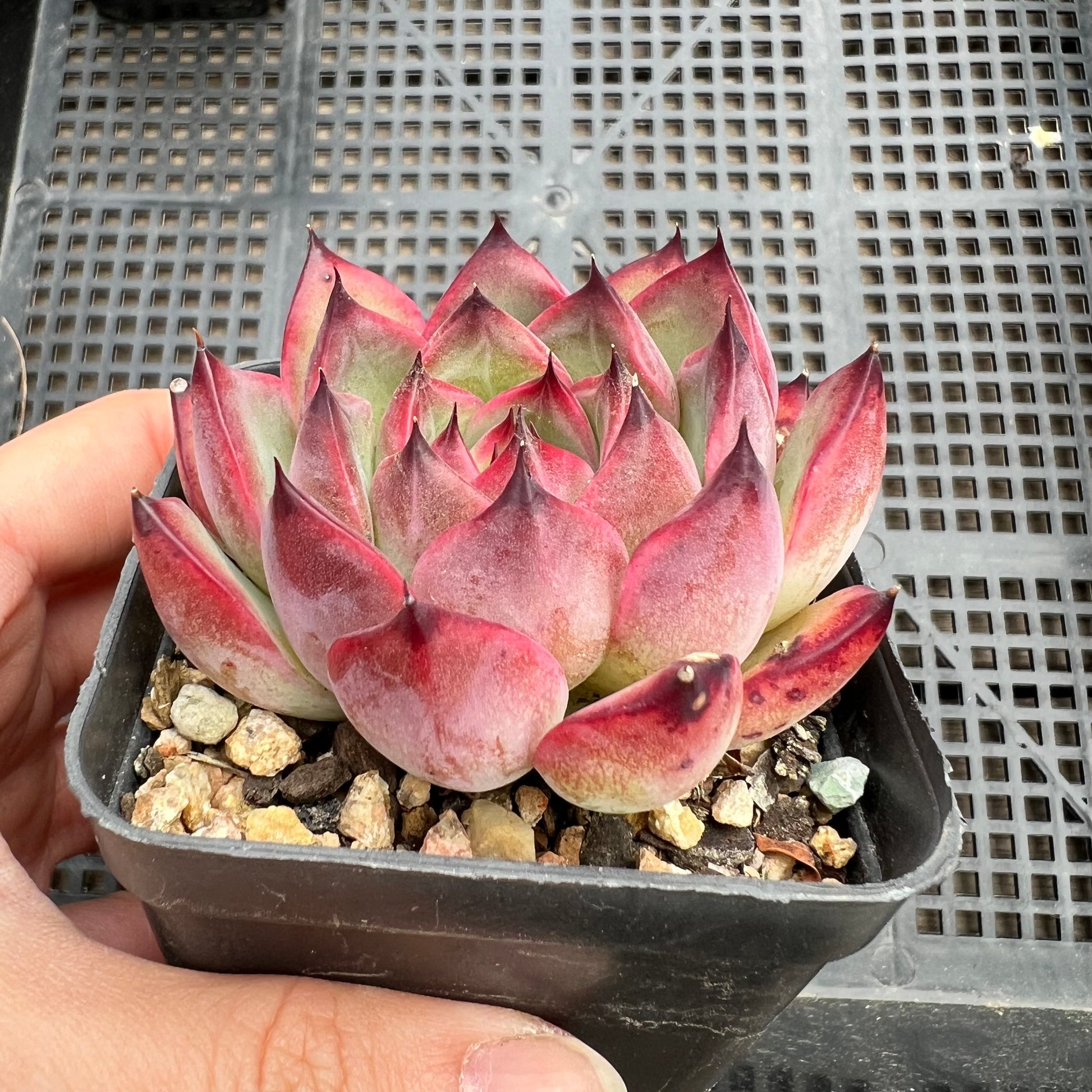 Echeveria Fire Pillar has flamming red edges and dark tips. It forms white markings when grown hard. Prefers full sun.