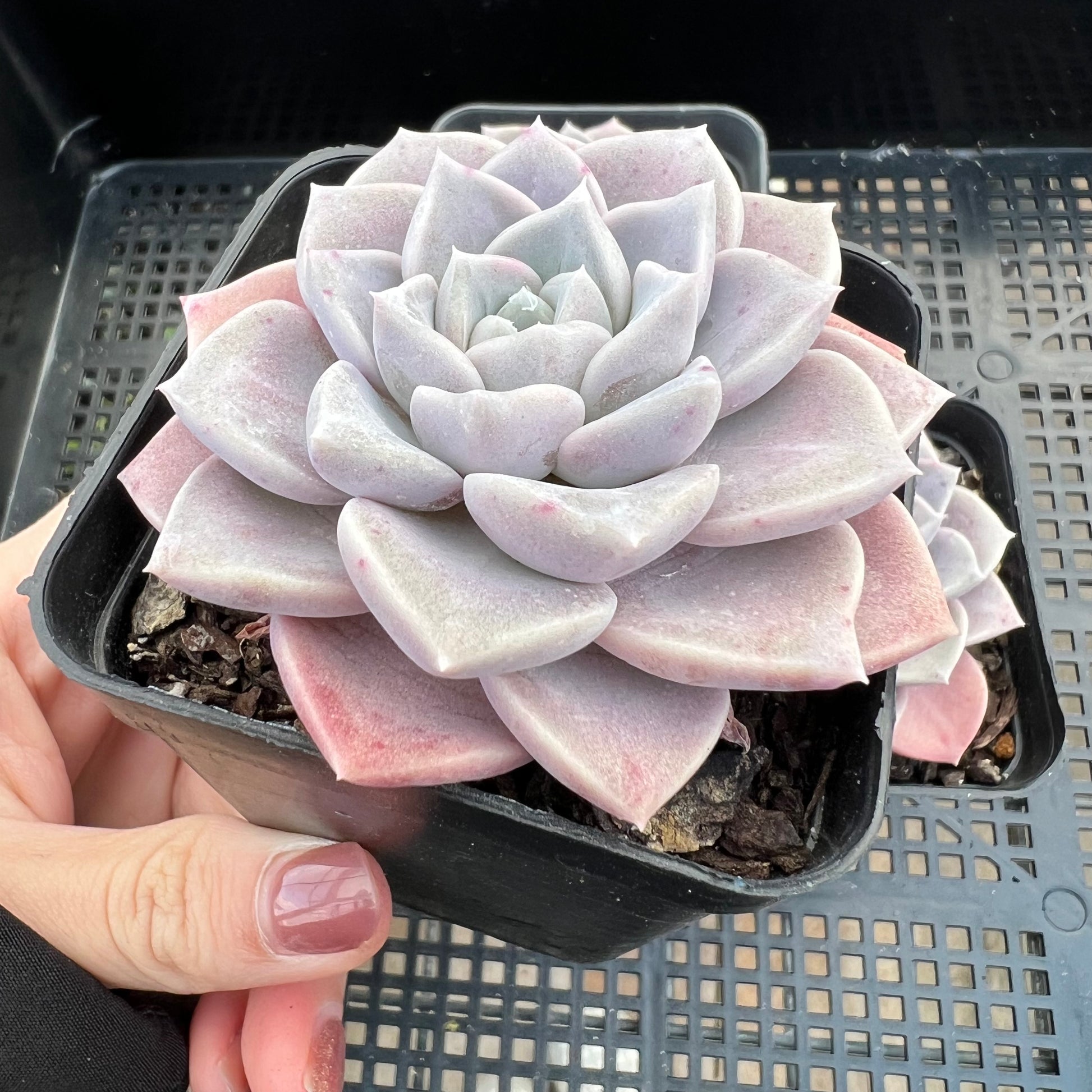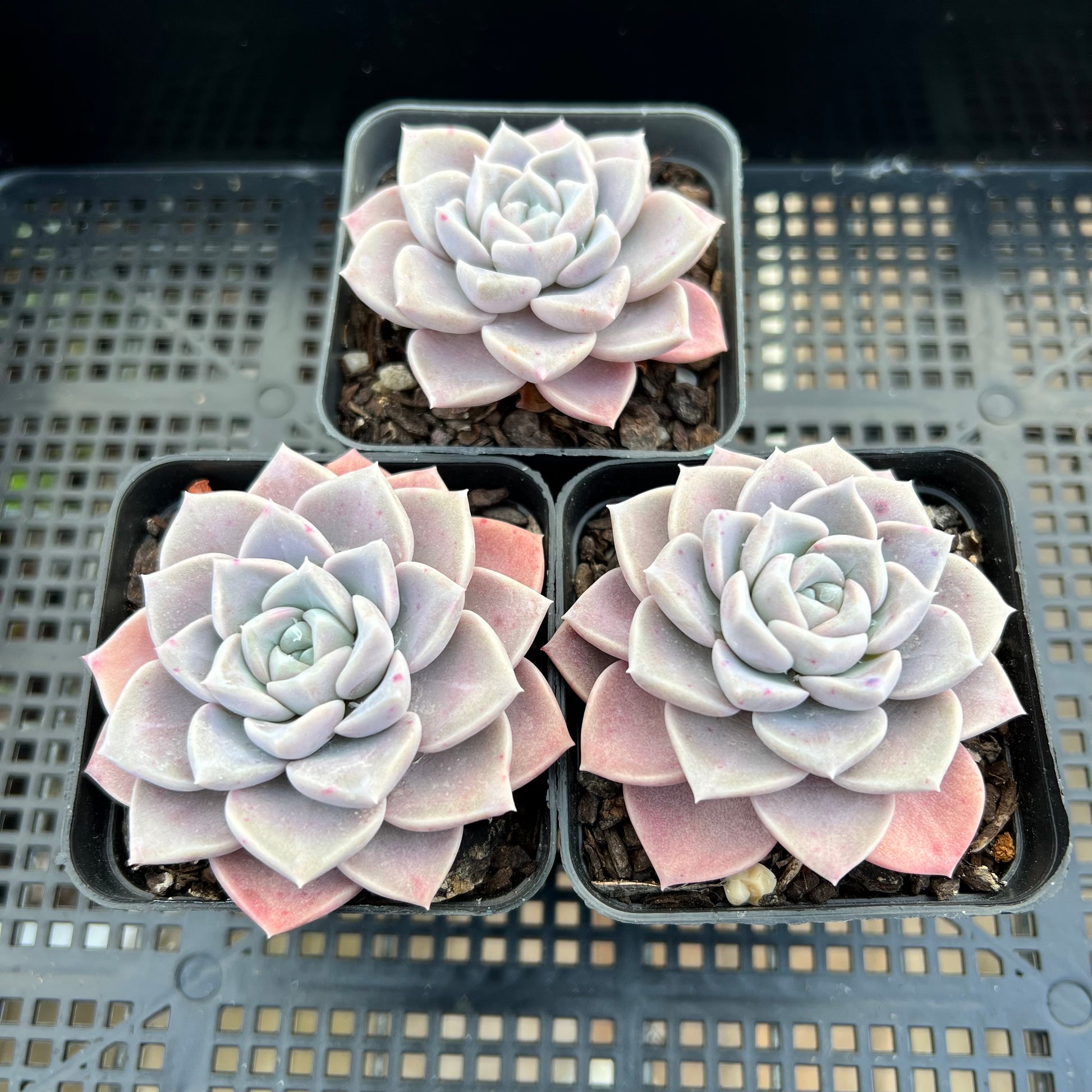 Echeveria Pink Star is a compact succulent with fleshy striking star-shaped petals in a muted pink hue. Lightly powdered. Prefer full sun.