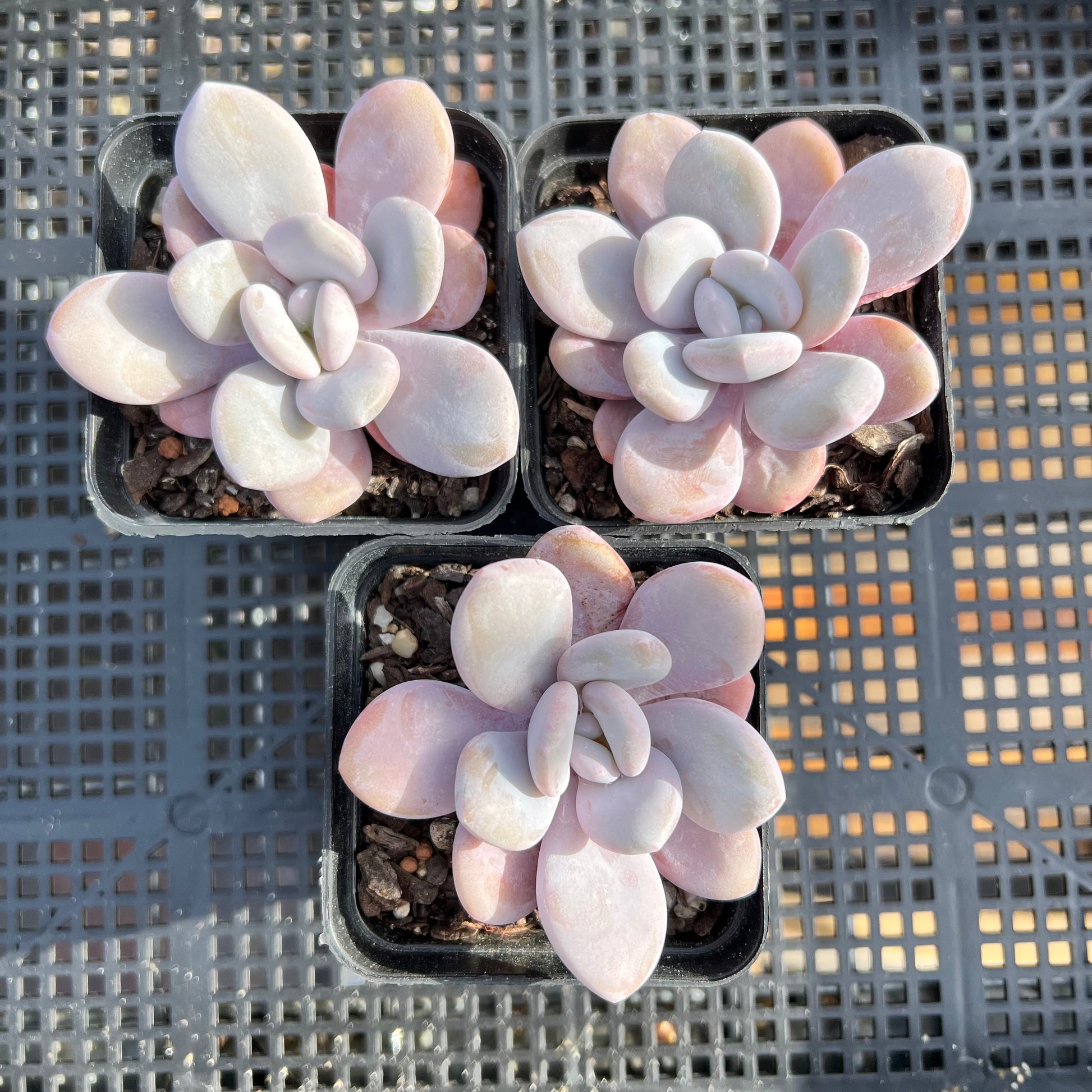 A hybrid of Graptopetalum amethytinum and Echeveria laui. Snow Peach has powdery oval leaves that blushes pink. An adorable variety to collect. Prefer full sun.