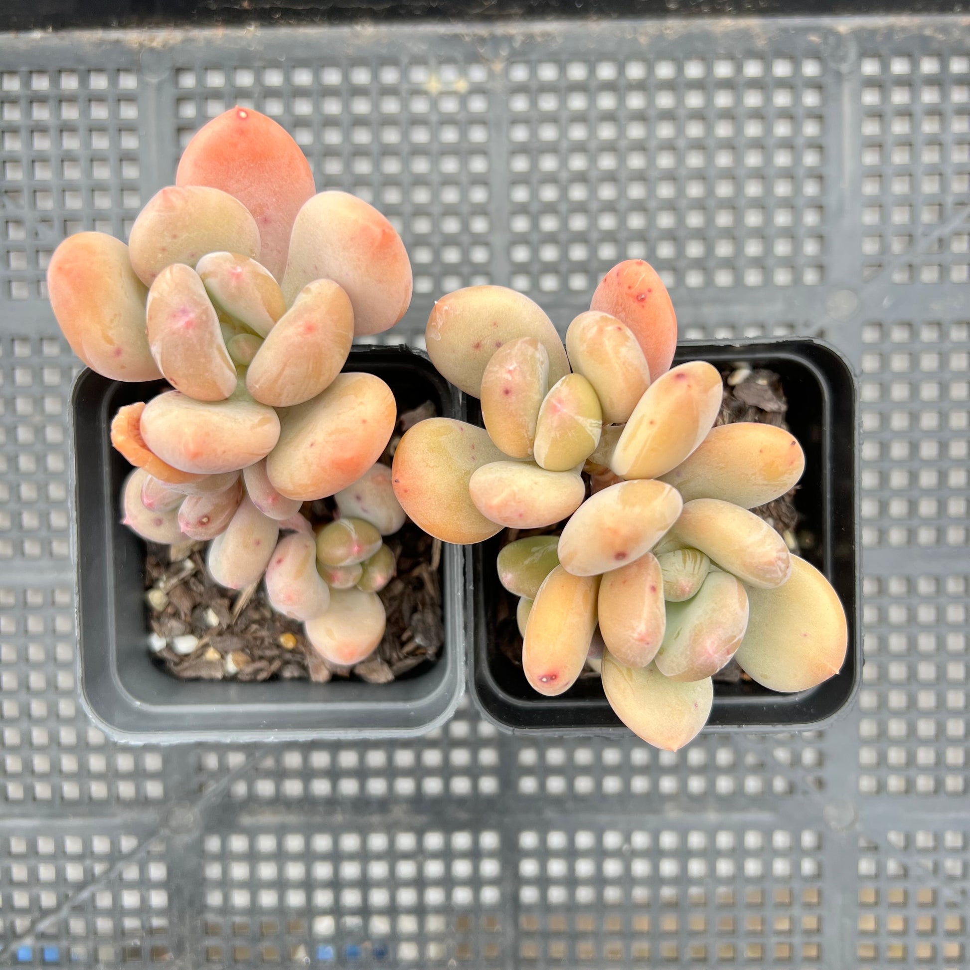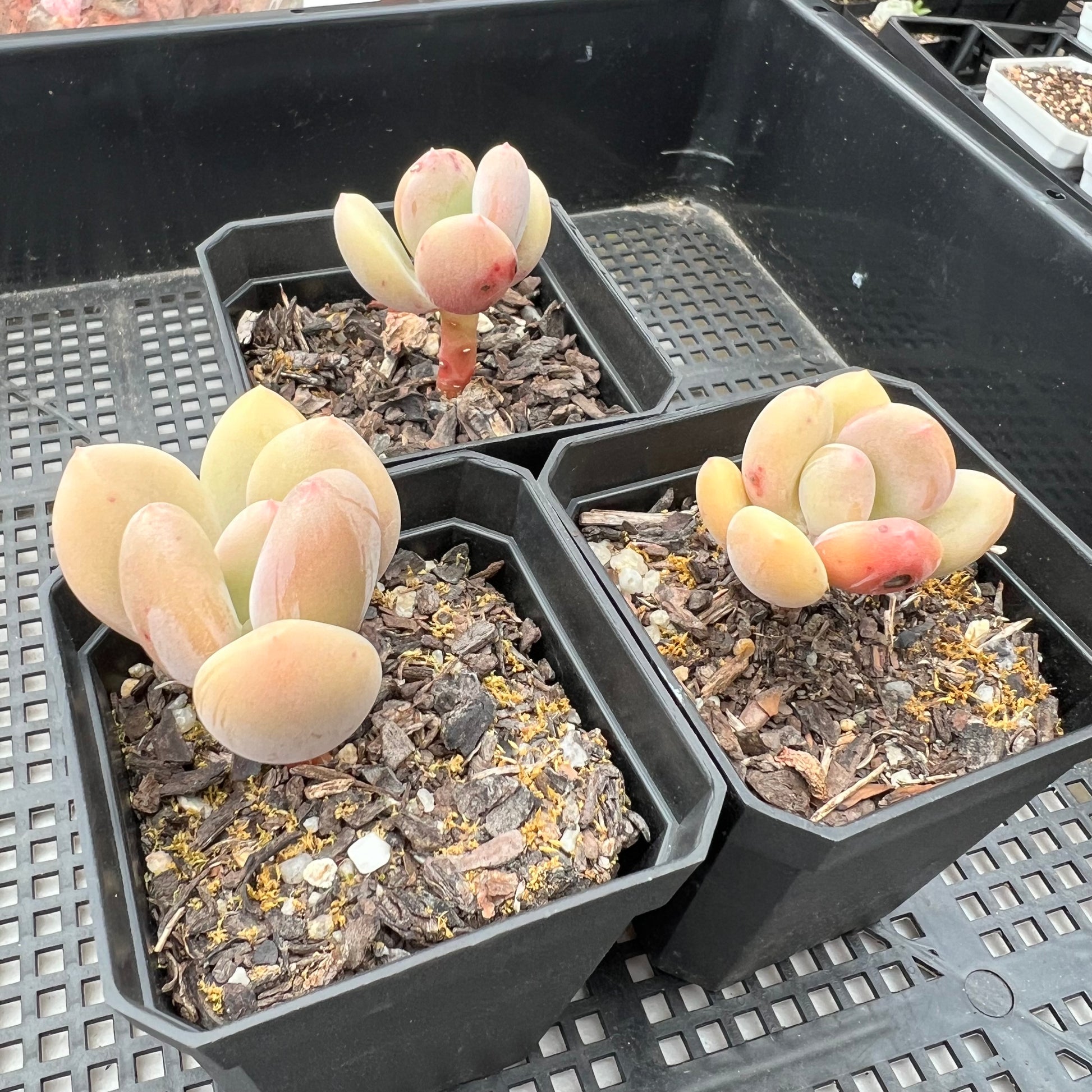 Pachyphytum Green Apple has wide leaves and pink tips, stress to orange. Prefers full sun.