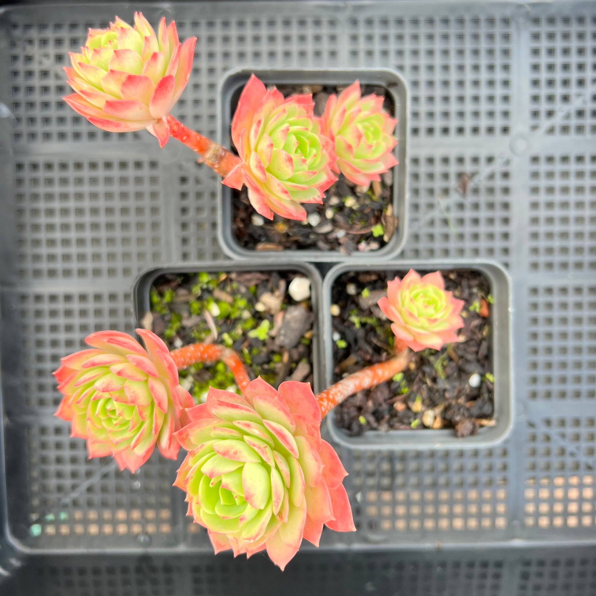 Sedeveria green rose has thin grass green leaves. The edge and tip of leaves stress to orange/pink colour. It clusters to a rosette like a rose. Prefers full sun.